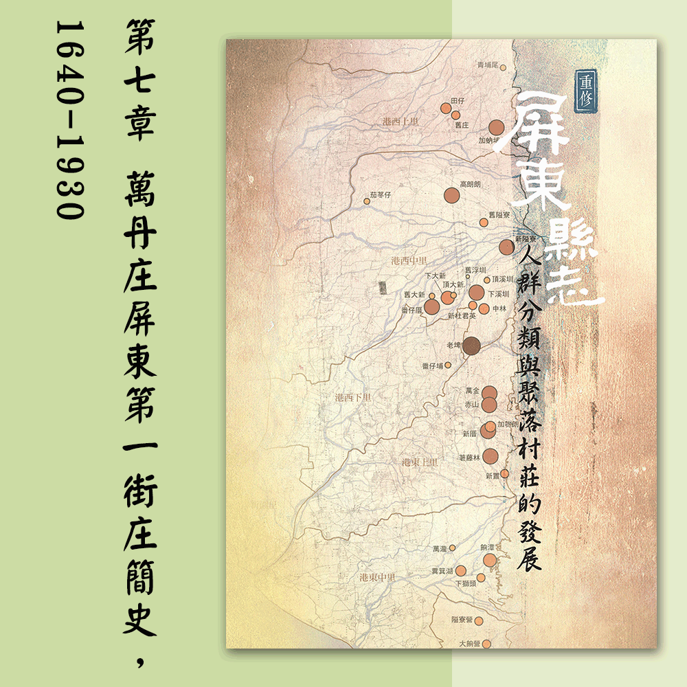 《重修屏東縣志:人群分類與聚落村莊的發展》〈第七章 萬丹庄:屏東第一街庄簡史〉出版時間為2014年11月,由陳秋坤、利天龍、莊天賜、曾坤木共同撰寫。本文主要描寫萬丹街庄的歷史發展脈絡。萬丹庄,在荷蘭治理時期(1624年至1662年),是麻里麻崙社外圍的漢人民社和農業商品市集,以及下淡水流域的行政、傳教、軍隊和商務駐地。在官方繪製的「卑南採金圖」,標示萬丹庄作為中途必經聯絡站。這種富庶景象一直延續到清代(1683年至1895年)。19世紀初期,清廷為了治理屏東北部社會治安問題,選擇阿猴社舊地也就是日後的屏東街,作為行政和駐軍中心。不過,許多官員認為該環境欠佳,於是決定到萬丹庄辦公駐紮。這是萬丹庄作為屏東地域第一街庄的一個例證。