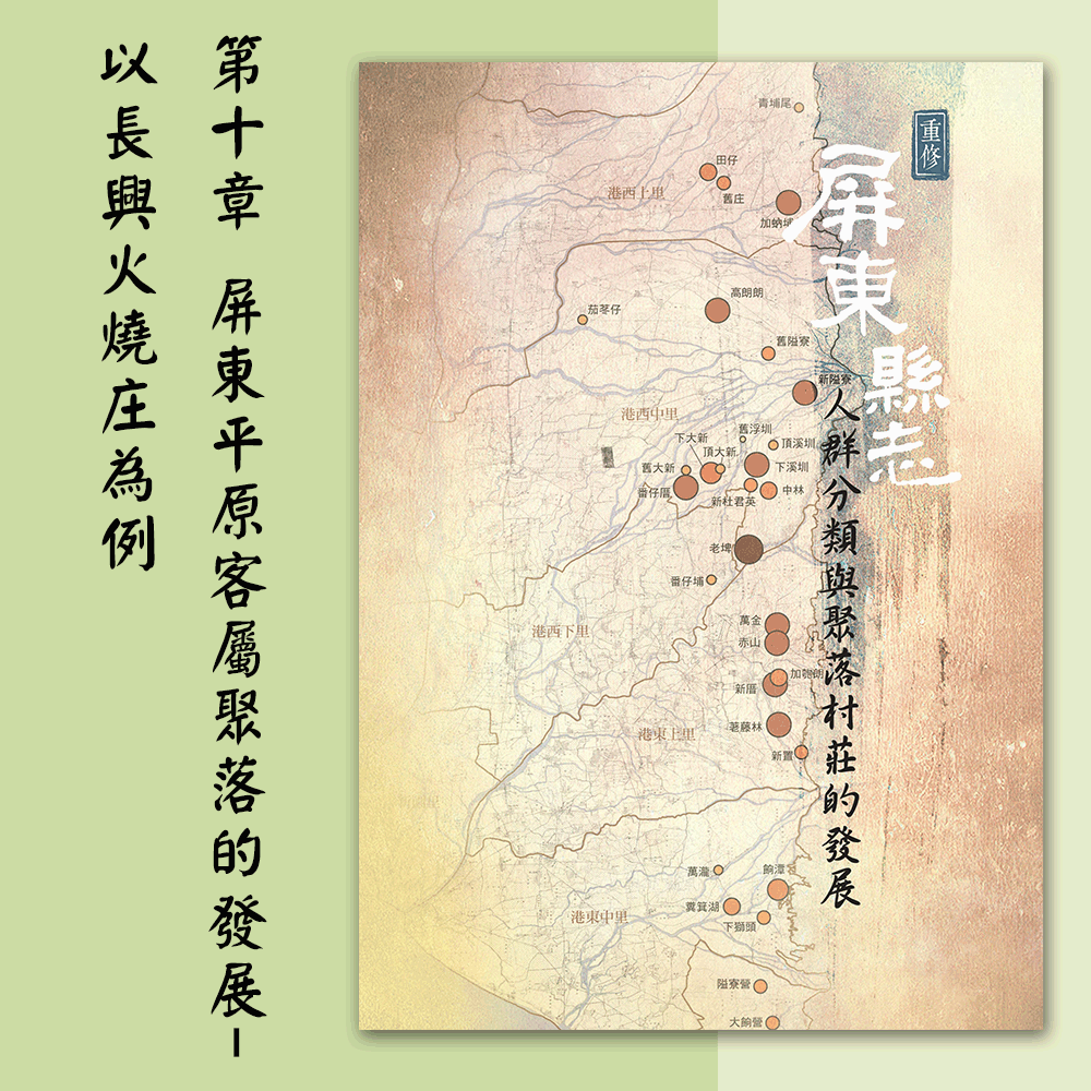 《重修屏東縣志:人群分類與聚落村莊的發展》〈第十章 屏東平原客屬聚落的發展-以長興火燒庄為例〉出版時間為2014年11月,由利天龍撰寫。本文主要描寫屏東平原客家聚落不同時期的發展。從康雍時期的土地拓墾到乾嘉時期客家聚落的對外關係。再到道光以後出現了管事家族的角色,最後是殖民勢力的入侵。其中最重要屬火燒庄戰役。