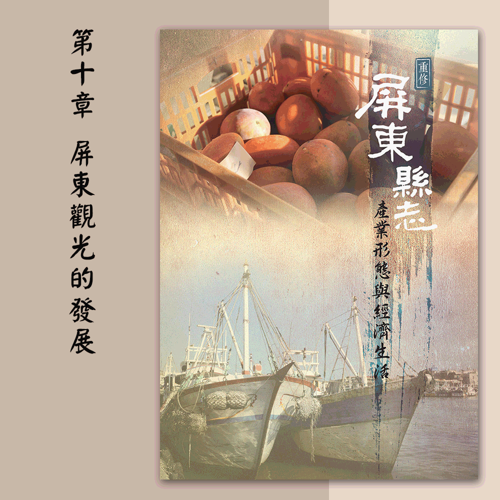 《重修屏東縣志:產業形態與經濟生活》〈第十章 屏東觀光的發展〉出版時間為2014年11月,由鄭力軒撰寫。本文主要描寫屏東觀光業的發展。我們將主要觸及兩個面向;墾丁的歷史發展以及重要特色小吃的發展歷程。作為臺灣最具代表性的觀光地,我們將詳細闡述從日治時期臺灣八景到當代春天的吶喊的變化。同時,我們也將介紹觀光如何帶動地方特色小吃的發展。1982年墾丁國家公園成立,國家公園成為墾丁地區的主要行動者。國家公園以「墾丁」為名,不僅強調墾丁地區自然資源的珍稀性,也強化墾丁遊憩系統在恆春半島觀光空間中的領導地位。但墾丁國家公園強調保育為主的力道更甚風景特定區時期。屏東無論官方還是民間,對屏東的觀光高度集中在墾丁的現象都感到憂慮,並積極發展墾丁之外的觀光資源,希望能將觀光更平均分配到不同區域的屏東縣民。目前有兩個主要發展:第一是透過地方飲食文化建立觀光的景點,最成功的就是萬巒豬腳與東港黑鮪魚;第二個則是透過中央政府的規劃建立新的觀光區域,代表的區域是大鵬灣的開發計畫。