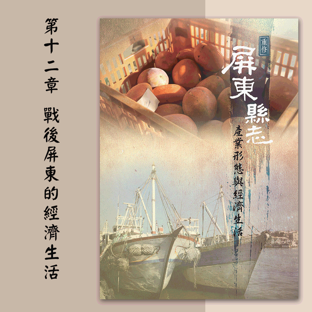 《重修屏東縣志:產業形態與經濟生活》〈第十二章 戰後屏東的經濟生活〉出版時間為2014年11月,由鄭力軒撰寫。本文主要從兩層面來描寫屏東戰後經濟生活的發展。一方面從各項指標來看,屏東縣民的生活水準大幅提高,不管家電和現代交通工具都大量普及,顯現出屏東日常經濟生活水準的提升。另一方面,隨著交通建設更加普及,在消費生活上屏東日益成為高雄的腹地,也形塑了戰後屏東商業發展的基本格局。