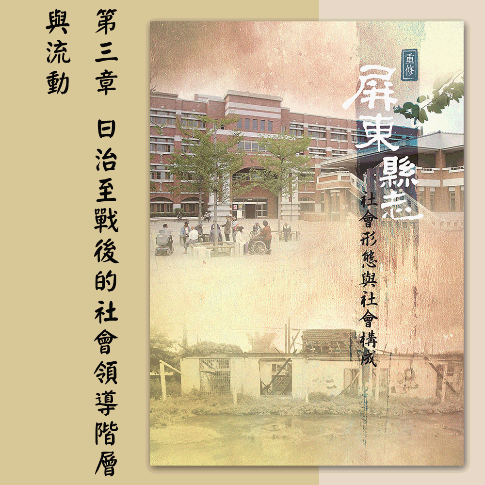 《重修屏東縣志:社會形態與社會構成》〈第三章 日治至戰後的社會領導階層與流動〉出版時間為2014年11月,由王御風撰寫。本文主要描寫臺灣日治時期到現在社會領導階層的演變。不同時期的政權對於臺灣社會領導階層的態度與互動方式。屏東地區幅員廣大,無論是總督府或國府均無法直接管理,需要與地方社會領導階層合作,才能有效管控。雖然如此,地方領導家族仍藉由新式教育,讓下一代延續政治經濟地位,順利接棒。屏東地區的社會領導階層經歷許多變化,戰後政權輪替,屏東地區社會領導階層原以為日本人離開,會讓其重拾地區政商地位。但在228事件、白色恐怖及土地改革後,許多地方領導階層選擇淡出政治,而政府也配合地方自治選舉,培植與其關係良好之「地方派系」,成為新的地方社會領導階層。