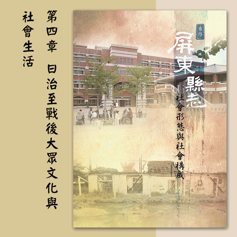 《重修屏東縣志:社會形態與社會構成》〈第四章 日治至戰後大眾文化與社會生活〉出版時間為2014年11月,由王御風撰寫。本文主要描寫從日治時期開始,屏東地區的社會因鐵路、糖廠的興建開始有了變化。就整體屏東地區而言,鐵公路帶來了運輸及都市的轉變,原本在海運時期極為重要的高屏溪(下淡水溪)沿岸城鎮,例如里港、萬丹、東港,逐漸因鐵路交通而萎縮。位居鐵路運輸中心的屏東市、潮州街,反而大力提升。大批日本人進駐屏東糖廠、行政機構和機場之後,帶來許多新事物與新生活。不過,所有休閒、體育,或是電話、汽車等現代化設備,都是以日本人及屏東市為主。顯然,新事物傳播和使用,呈現城鄉,甚至是族群的差別;直到戰後才逐漸縮小差距,新科技逐漸普及。
