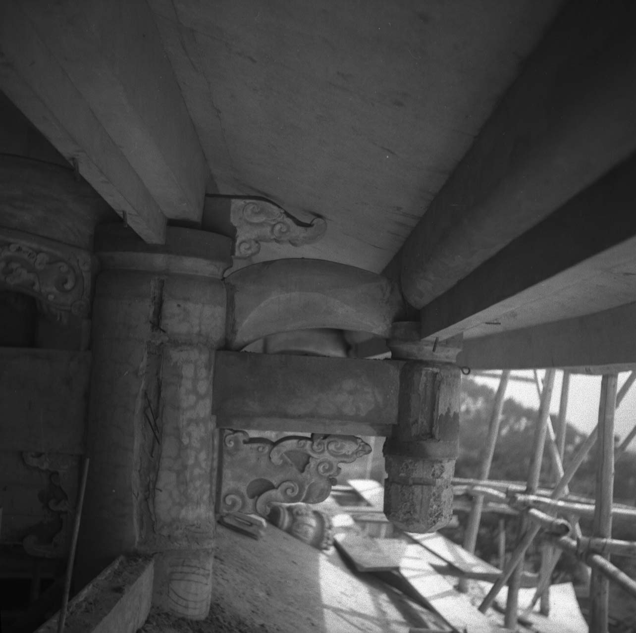 北投關帝廟工程時期之攝影記錄。該圖所攝者為郭氏工程團隊製作之水泥仿木構件。可見水泥在乾化過程中的濕痕。