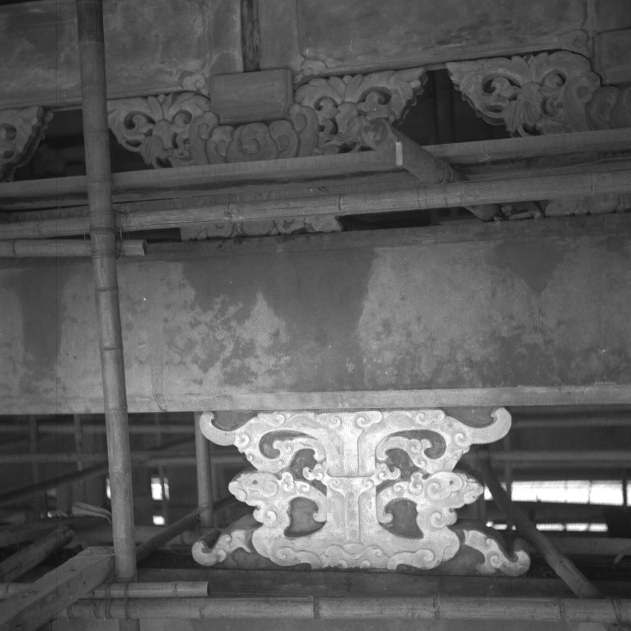 為北投關帝廟水泥仿木結構之攝影,為支撐樑柱之螭虎形構件。