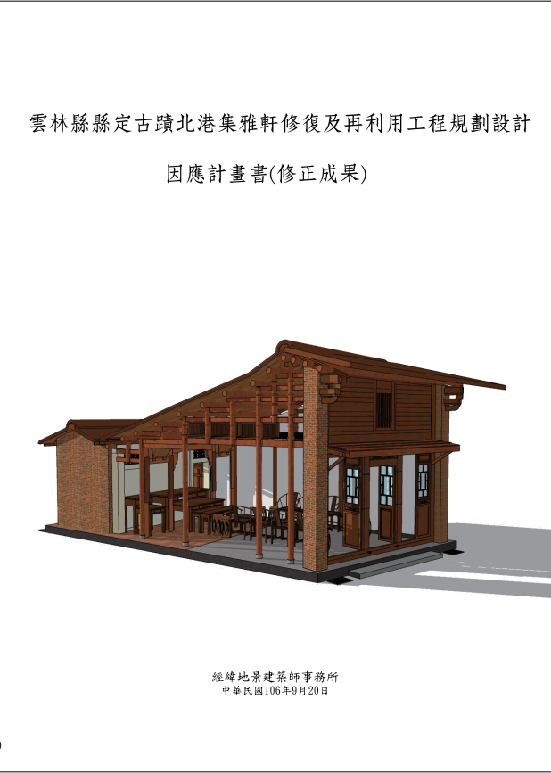 「雲林縣縣定古蹟北港集雅軒修復及再利用規劃設計因應計畫書」是由雲林縣政府委託經緯地景建築師事務所執行「雲林縣縣定古蹟北港集雅軒修復集再利用規劃設計因應計畫」所編著的成果報告書,於2017年9月出版。