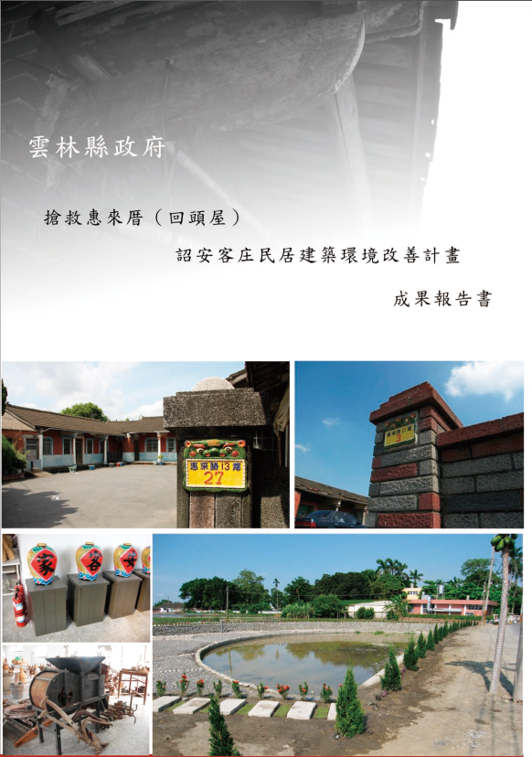 「搶救惠來厝(回頭屋)詔安客庄民居建築環境改善計畫成果報告書」是由雲林縣政府委託李浚熒建築師事務所執行「搶救惠來厝(回頭屋)詔安客庄民居建築環境改善計畫」所編著的成果報告書。該書記錄執行團隊在來惠社區的文史調查結果和與當地居民一同合作進行社區營造的過程,從本書可看到來惠社區的居民在這次計畫非常投入於社區事務,是了解詔安客家聚落和社區營造重要的參考資料。