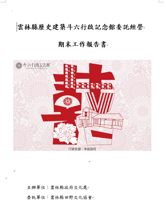 「雲林縣歷史建築斗六行啟記念館委託經營期末報告書」是由雲林縣政府委託雲林縣田野文化協會執行「雲林縣歷史建築斗六行啟記念館」所編著的期末報告書,由黃莉婷計畫主持,鄭彥福、鄭富源協同主持。本書記錄執行團隊在2014年到2015年經營斗六行啟記念館的工作成果,在這段期間執行團隊以「影像紀錄」為主題,辦理老照片徵集展覽、影像雲林溪以及雲林公民行動影像記錄特展,讓民眾透過影像更了解雲林的文化歷史。執行團隊也不定期辦理藝文講座和工作坊,透過執行團隊的努力讓原本閒置的斗六行啟記念館能被再利用,並透過辦理活動和展覽讓民眾了解雲林,是文化資產活用的良好範例。