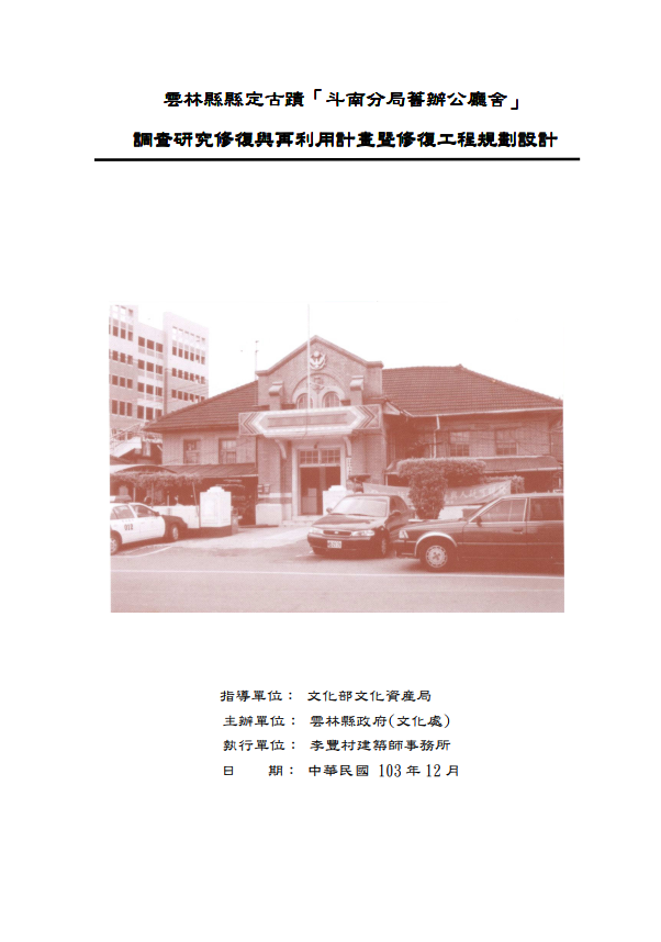 「雲林縣縣定古蹟「斗南分局舊辦公廳舍」調查研究修復與再利用計畫暨修復工程規劃設計」是由行政院文化部文化資產局指導,雲林縣政府委託李豐村建築師事務所執行「雲林縣縣定古蹟『斗南分局舊辦公廳舍』調查研究修復與再利用計畫暨修復工程規劃設計」所編著的成果報告書,於2014年12月由雲林縣政府出版。本書收錄斗南分局舊辦公廳舍的歷史、建築空間、建築構造以及建築損壞的調查,包含保甲事務所、刑事組、拘留所、消防隊和迴廊等資料。而執行團隊也為斗南分局舊辦公廳舍規劃修復和再利用計畫,為往後斗南分局舊辦公廳舍的修復及再利用提供重要的參考依據。