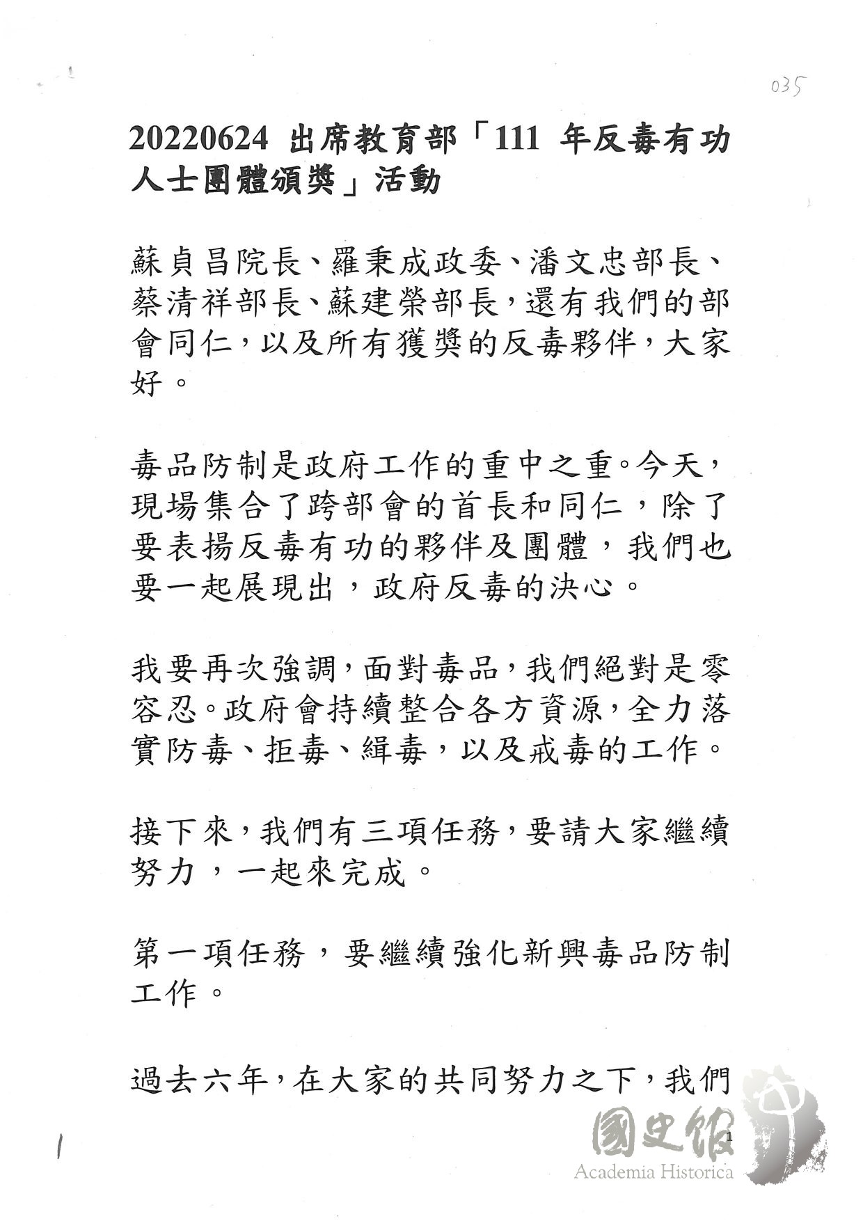 總統蔡英文出席111年全國反毒有功人士團體頒獎活動