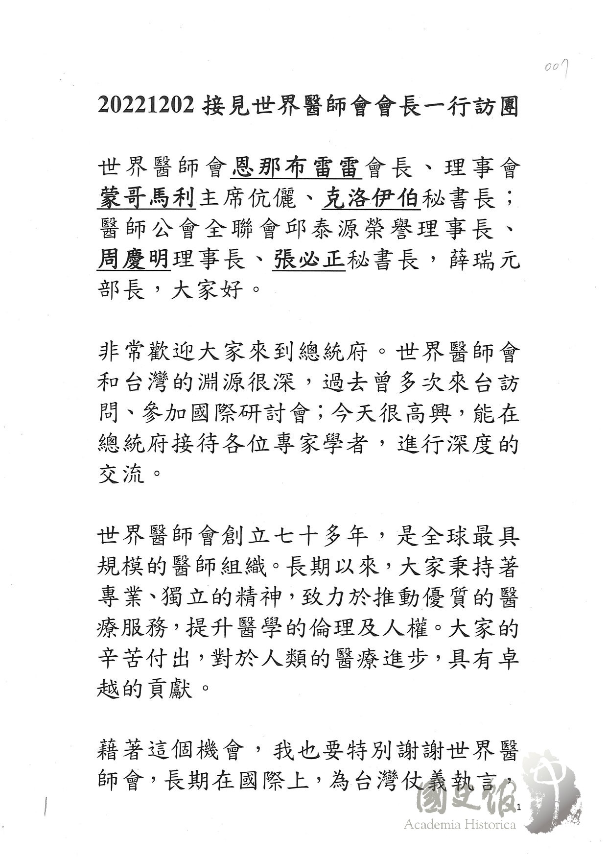 總統蔡英文接見世界醫師會會長恩那布雷雷(Osahon Enabulele)領袖訪臺團致詞(中文版)