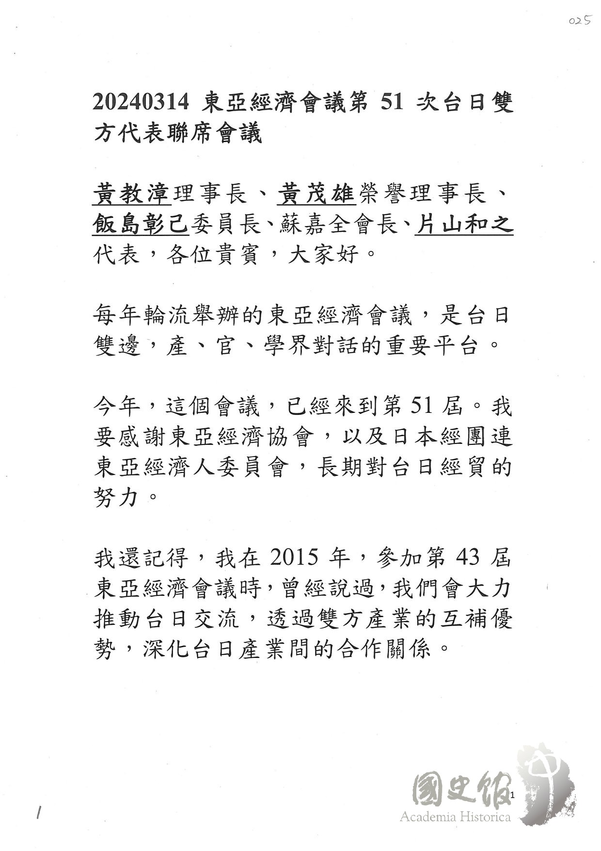 總統蔡英文出席東亞經濟會議第51次台日雙方代表聯席會議開幕式