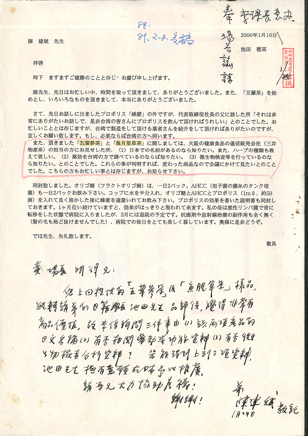 2000年李興進收到場長諭請回覆從日本來詢問五葉參茶與魚腥草茶相關問題之信件