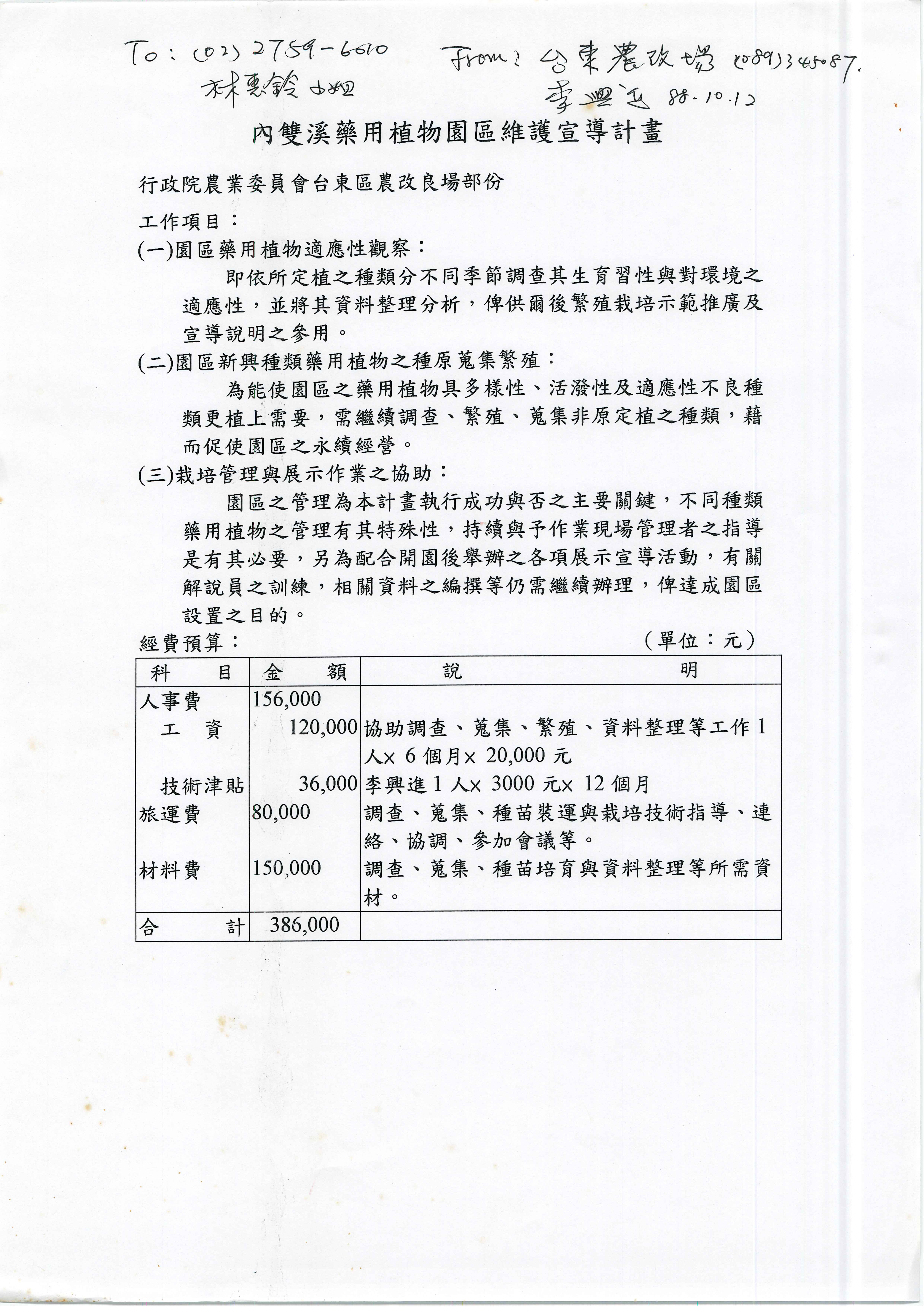 此文件為1999年李興進參與「86年度內雙溪森林藥用植物園區維護宣導計劃」-行政院農業委員會台東區改良場協助項目。李興進任職台東區農改場期間,除致力於台灣原生藥用植物調查,蒐集,栽培與研發外,亦積極協助國內以藥用植物為景觀植物等應用之休閒農場或園區建立,並協助規劃種原之提供與訓練種子解說員。本計畫中,李興進協助園區藥用植物適應性觀察、園區新興種類藥用植物之種源蒐集繁殖、栽培管理與展示作業之協助。