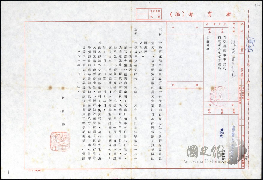 教育部函外交部領事事務司、內政部入出境管理局為中央研究院三民主義研究所劉石吉、張炎憲、湯熙勇前往日本出席會議請核發出國護照、入境證;公文文號:教育部民國77年11月30日台(77)文58185號函