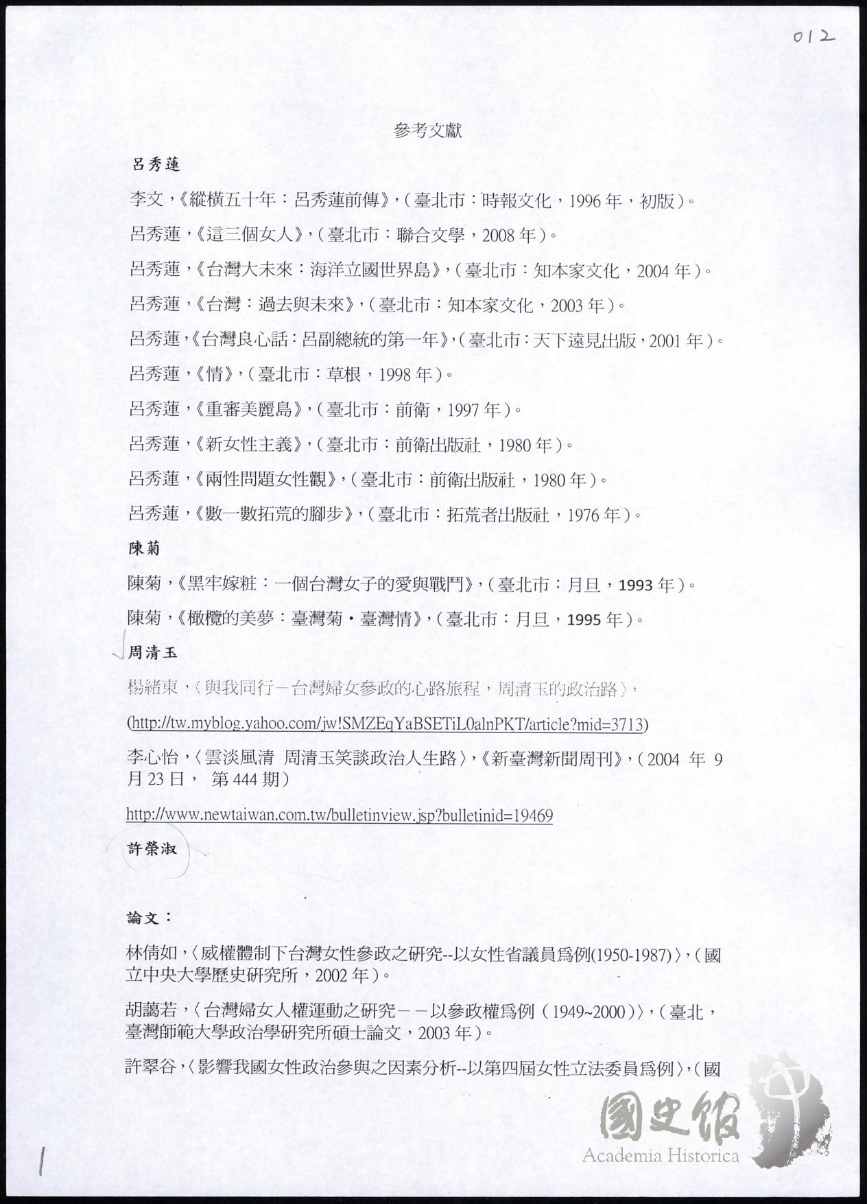 呂秀蓮、陳菊、周清玉、許榮淑之學經歷及參考文獻