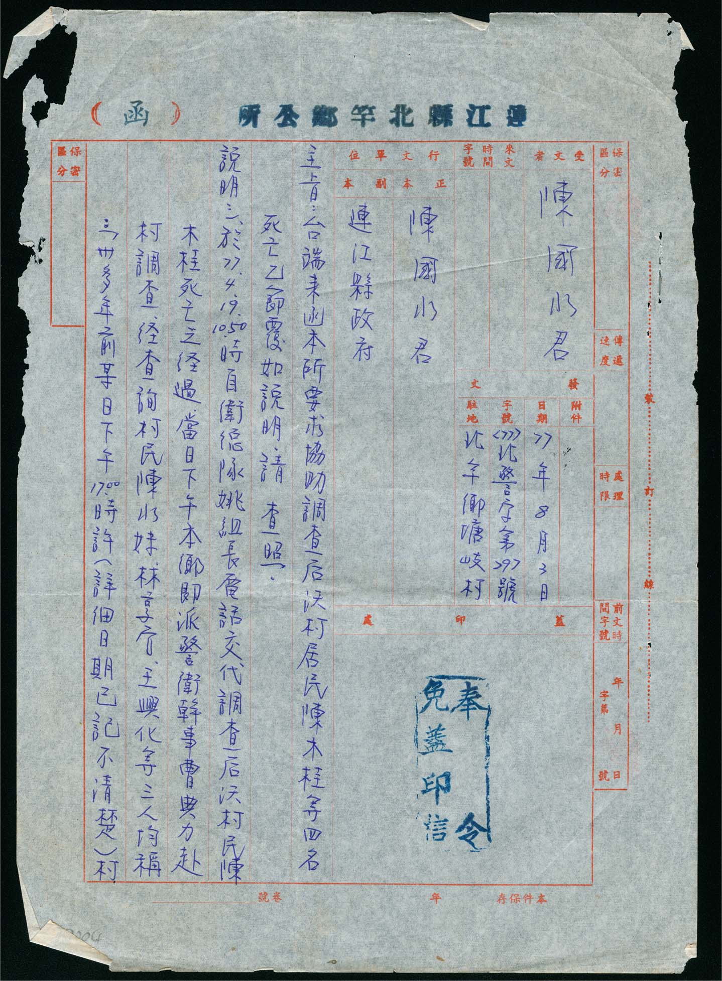 本物件為2017年透過<馬祖民俗文物館展示文物提昇計畫>所收集之系列物品。此物件為北竿鄉公所給陳國水先生函要求調查后沃村自衛隊隊員陳木桂回覆書信,為1988年8月2日由北竿鄉公所行文陳國水先生告知其案之經過及將其案轉向連江縣政府。后沃民防隊員誤踩地雷事件為1952年8月4日下午五點,指導員集合北竿后沃村自衛隊隊員前往后沃沙灘清掃漁船及清掃射界。其因部隊於沙灘設下反登陸地雷未告知,導致王壽今、林嫩嫩、陳木桂和吳依水四位民防隊員因任務身亡。此案從1988年6月開始向連江縣政府陳情,直到1993年8月3日,內政部行文請國防部依「自衛隊員因公傷亡撫卹暫行標準」核發撫卹金,並予褒揚。