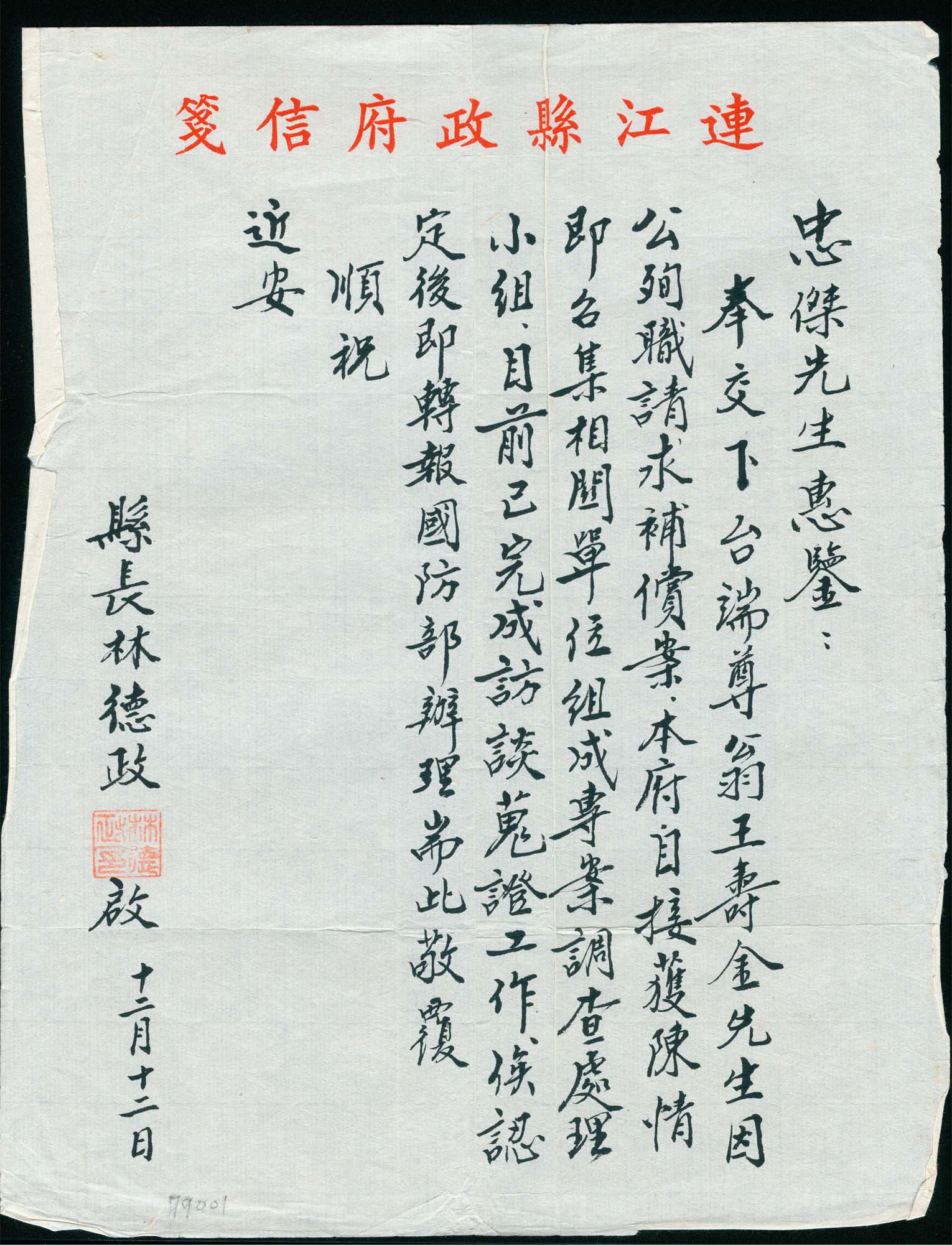 本物件為2017年透過<馬祖民俗文物館展示文物提昇計畫>所收集之系列物品。此信為給忠傑先生(為殉職隊員王壽金之子)信件內文為「忠傑先生惠鑒,奉交下台端尊翁王壽金先生因公殉職請求補償案,本府自接獲陳情即召集相關單位成專案調查處理小組,目前已完成訪談蒐證工作,俟認定後即轉報國防部辦理耑此敬覆。順祝 近安。縣長林德政啟 十二月十二日。」后沃民防隊員誤踩地雷事件為1952年8月4日下午五點,指導員集合北竿后沃村自衛隊隊員前往后沃沙灘清掃漁船及清掃射界。其因部隊於沙灘設下反登陸地雷未告知,導致王壽今、林嫩嫩、陳木桂和吳依水四位民防隊員因任務身亡。此案從1988年6月開始向連江縣政府陳情,直到1993年8月3日,內政部行文請國防部依「自衛隊員因公傷亡撫卹暫行標準」核發撫卹金,並予褒揚。