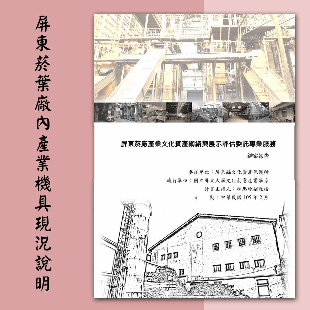 日治時期屏東地區菸葉專賣事務隸屬「臺灣總督府臺南支局屏東辦事處耕作係」,至1924年(大正13年)屏東辦事處升格為「屏東支局」後仍隸屬耕作係,掌理種菸許可、田間栽培技術輔導、菸葉採收乾燥、調理以及收購等業務。屏東菸葉廠建於日治時期1936年(昭和11年),當時稱之為「屏東支局葉煙草再乾燥場」。1937年(昭和12年)起開始作業,增加菸葉複薰、裝桶以及儲存等業務。本文主要介紹屏東菸葉廠的機具,共分為六大部分,首先介紹目前機具位置、廠牌等基礎史料,並藉由內埔菸廠提供的機具文獻進行研究,最後介紹各個機具的細部。目前屏東菸葉廠遺留下當時的菸葉加工機具,主要有除骨機、複薰機、包裝機、集塵設備等四類。關於菸葉加工機具廠牌,主要從目前尚留在屏東菸葉廠廠區內機械的製造廠商標籤來蒐集資料,但部分機具並無製造廠商標籤,因此僅以可蒐集到的資料來進行說明。除骨機由美國公司生產;震盪機(vibrating equipment)亦由美國公司所製造;而菸肉複薰機在1986年由行政院國軍退除役官兵輔導委員會在臺北鐵工廠製作。