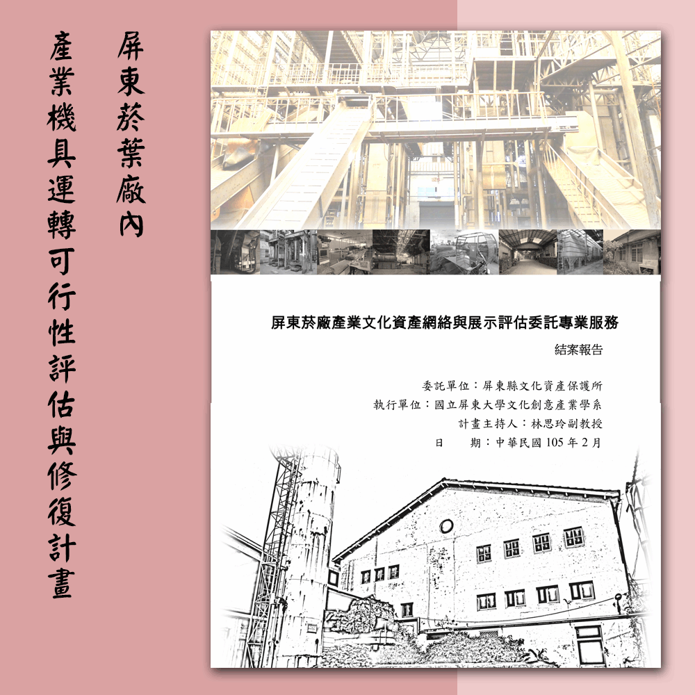 日治時期屏東地區菸葉專賣事務隸屬「臺灣總督府臺南支局屏東辦事處耕作係」,至1924年(大正13年)屏東辦事處升格為「屏東支局」後仍隸屬耕作係,掌理種菸許可、田間栽培技術輔導、菸葉採收乾燥、調理以及收購等業務。屏東菸葉廠建於日治時期1936年(昭和11年),當時稱之為「屏東支局葉煙草再乾燥場」。1937年(昭和12年)起開始作業,增加菸葉複薰、裝桶以及儲存等業務。本文主要針對屏東菸葉廠的機具進行運轉可能性評估與後續的修復計畫,由於目前屏東菸葉廠菸葉加工機具,是由許多不同公司在不同時期所生產的機械所組裝起來,有國外生產的,也有臺灣生產的。而當年的操作手冊雖然有被使用過,但因屏東菸葉廠的員工逐漸熟悉機械操作方式,大家也沒有再看手冊,手冊也遺失。後來菸葉加工機具的操作都是靠有經驗的技士口述傳承。本文邀集三位曾操作過屏東菸葉廠菸葉加工機具的項亦文技士(當時服務於屏東菸葉廠工安課)、王金田技士、陳仁彰領班,再偕同本研究農業機具顧問國立屏東科技大學洪辰雄教授,以及兩位水電工程師彭耀雄先生(龍豐水電工程行負責人)與林勇福先生,數次回到屏東菸葉廠查看機具,評估運轉的可行性與後續的修復計畫。