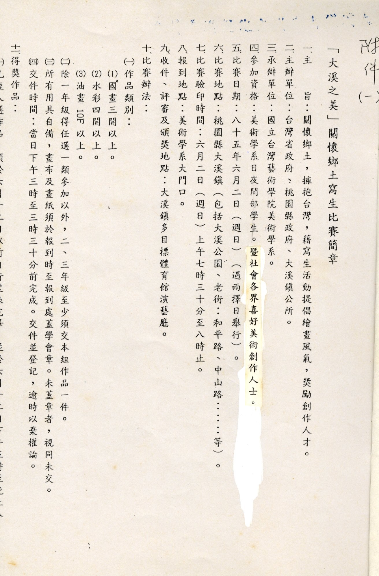 本物件為「大溪之美」關懷鄉土寫生比賽簡章之比賽簡章,內容包含主旨、參賽資格、比賽日期及比賽地點。 「大溪之美」關懷鄉土寫生比賽係由台灣省政府、桃園縣政府及大溪鎮公所主辦,國立台灣藝術學院美術學系所承辦之藝文活動,旨在關懷鄉土,擁抱台灣,藉寫生活動提倡繪畫風氣,獎勵創作人才。舉辦時間為1996年6月2日,對象資格為台灣國立藝術學院美術學系日間、夜間部學生,和社會各界喜好美術創作人士。得獎作品在上述同年6月24日至6月29日於該校美術學系大樓展出。作品中指涉地點主要為大溪鎮之範圍內,重點在老城區部分。