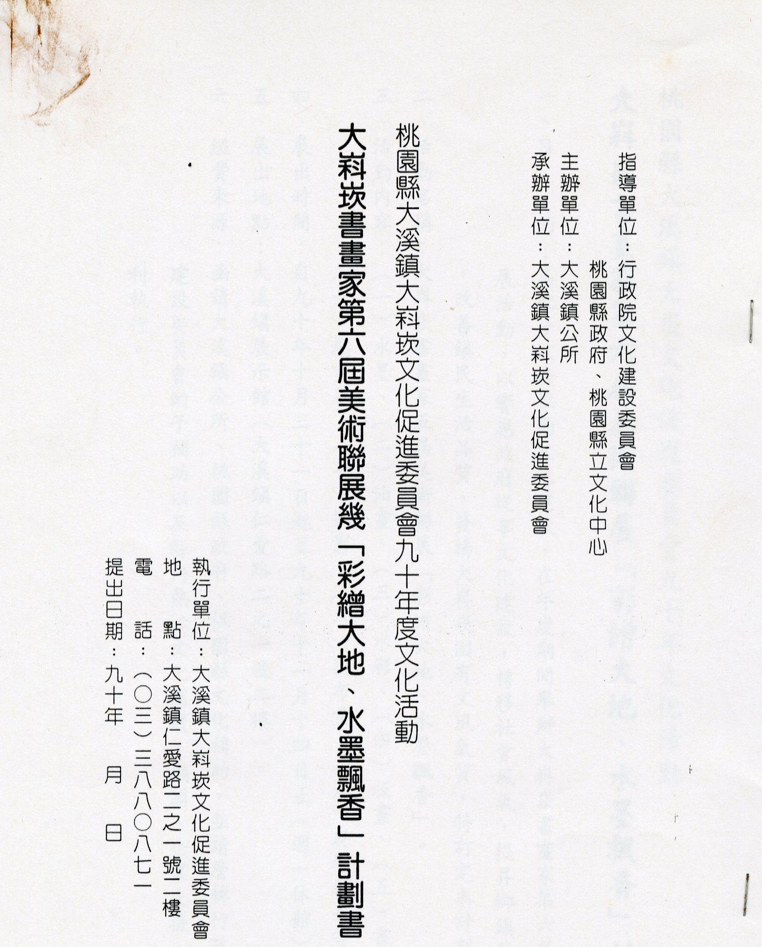 「彩繪大地、水墨飄香」大嵙崁書畫家第六屆美術展覽活動,民國90年10月31至11月14日於大溪鎮展示館舉行。