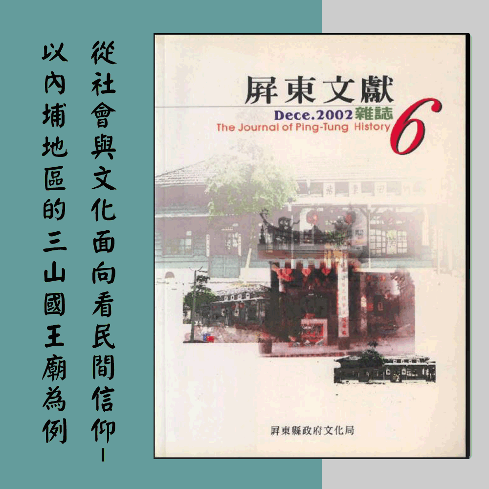 《屏東文獻第6期》〈從社會與文化面向看民間信仰-以內埔地區的三山國王廟為例〉出版於2002年12月,由呂仁偉撰寫。本文分別就各村落開發與三山國王廟建立的關聯性作一探討,並運用地方志與宗祠碑文等文獻資料作為參考,配合田野考察訪問,勾勒出內埔地區三山國王信仰的歷史輪廓及宗教特質。臺灣民間信仰本質上是一種社會的結合,而寺廟的建立與發展可說是一地社會發展的縮影。因此藉由一地廟宇之形成與演變,可瞭解當地族群活動的脈絡,並可從中觀察出其開發過程中的特質。