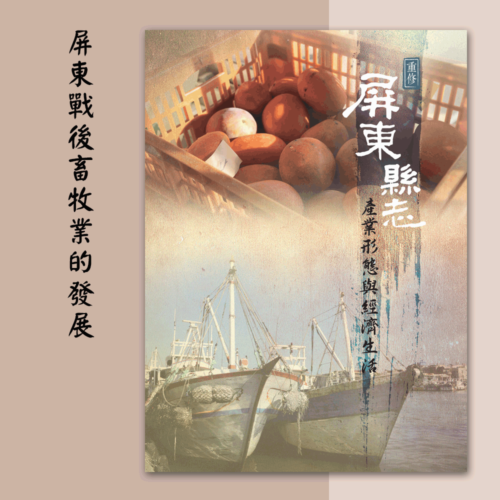 《重修屏東縣志:產業型態與經濟生活》〈屏東戰後畜牧業的發展〉出版時間為2014年11月,由鄭力軒撰寫。本文主要介紹屏東畜牧業的發展。屏東曾經是養豬王國,也誕生數家大型現代化畜牧機構。但在為屏東帶來巨額財富的同時,過度畜牧所帶來的病變,以及豬隻糞尿所帶來的環境污染,導致了屏東養豬業的危機,本文將仔細介紹這個過程。屏東養豬業最關鍵的事件就是農復會由畜牧組長李崇道發起,在1963年1月選在屏東萬丹試辦「綜合養豬計畫」,但在屏東養豬業蓬勃發展的同時,養豬所帶來的高污染逐漸成為影響發展的負面因素。面對養豬業的汙染問題與口蹄疫的打擊,屏東養豬業數量雖然大減,但質卻有所提升。養牛產業的發展屏東也占有一席之地。1972年農林廳大利推廣「二八制」,也就是八成土地種植糧食作物,兩成土地種植牧草。同時也發展養牛場,但面臨加入WTO的衝擊而關閉。目前推行公牛體系,除了賣牛奶外也兼賣種牛,在新模式之下,屏東牛隻近年穩定成長到24000頭左右。