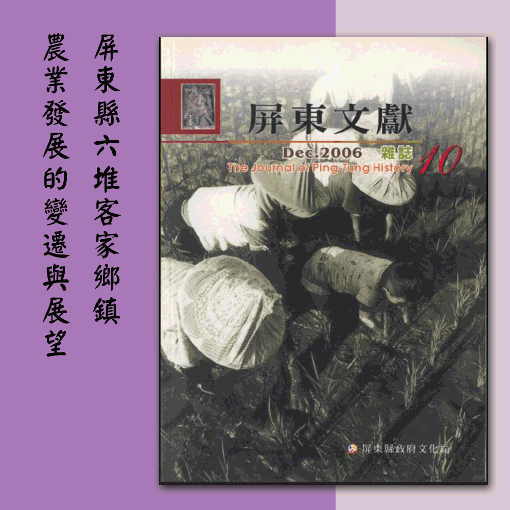 《屏東文獻第10期》〈屏東縣六堆客家鄉鎮農業發展的變遷與展望〉出版於2006年12月,由陳明昭撰寫。本文主要介紹六堆各鄉鎮農業發展的變遷、農業技術的沿革,文末則寫有對六堆客家鄉鎮農業發展的未來展望。於臺灣光復之初期,農業生産技術落後,此時務農只能靠雙手及簡單之工具。政府播遷來臺,為充裕軍胥民糧,努力生產糧食,首先實施土地改革政策,實施三七五減租、公地放領、耕者有其田,奠定農業發展基礎。1981年政府進一步完成農地重劃創舉,規劃産業道路與灌排水系統,及大型農業機械使搬運稻榖與物件方便自如,提高了工作效率與農機器利用率。