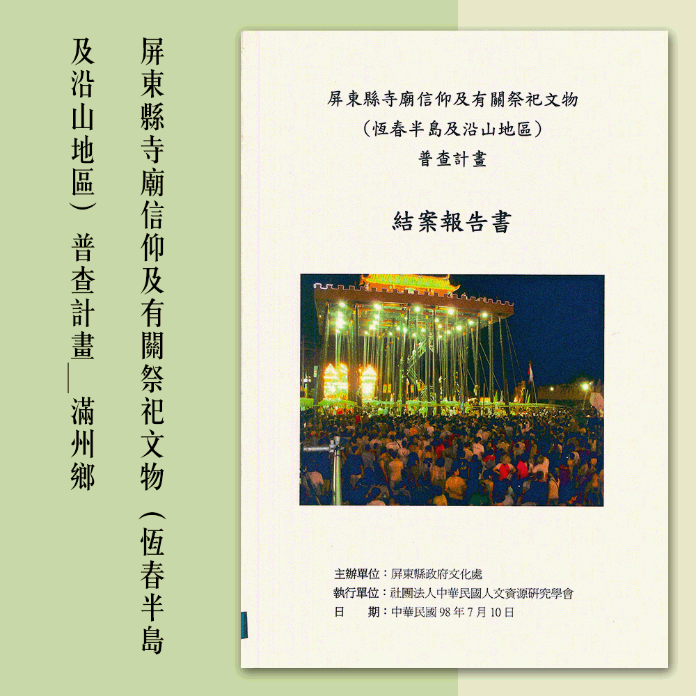 本文主要清查滿州鄉的寺廟信仰及有關祭祀文物,其中較重要的包含羅峰寺八保大典、長樂村信天宮朱府聖誕進香、照靈宮五府千歲聖誕慶典、滿州慈鳳宮花蓮進香、茶山福德宮登刀梯、萬法寺關地門、順天宮禁乩科儀。