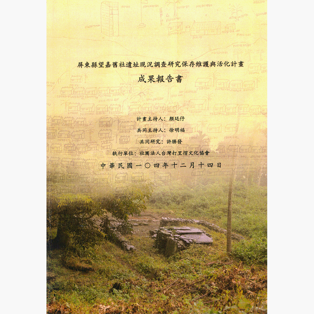 本報告書分為第一章前言;第二章望嘉舊社遺址羣與遺址範圍;第三章望嘉舊社的配置及重要據點;第四章望嘉舊社祭壇與家屋測繪結果;第五章望嘉舊社的聯外道路;第六章物質文化保存狀況;第七章考古試掘結果-探坑與地層;第八章考古試掘結果-文化遺跡;第九章考古試掘結果-文化遺物;第十章考古挖掘結果-生態遺留;第十一章考古挖掘結果-年代與文化內涵;第十二章望嘉舊社的文化資產重要性分析;第十三章保存概念與活化文化資產策略;第十四章結論。