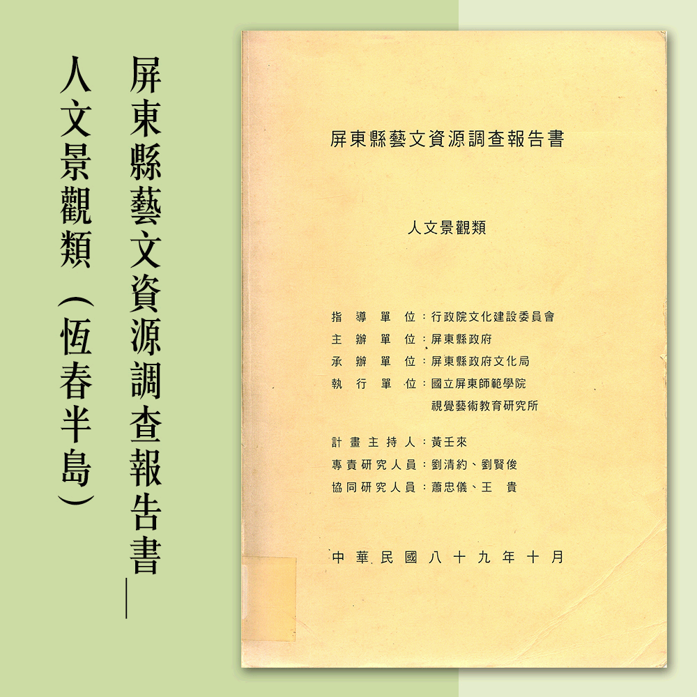 屏東縣人文景觀調查範圍遍及本縣33個市鄕鎭,調查區域蘊藏多元族群文化與藝術之美;除了排灣與魯凱族群的山地文化藝術以外,尚有閩南及客家族群聚落的人文景觀特色。屏東縣人文景觀之調查主要是根據陳憲明(民國86年)的人文景觀分類條目舉例,將人文景觀分為11類,並依據各鄉鎮市之特色,選擇調查各類人文景觀。經調查統計屏東縣人文景觀數量為272件,調查分類數量為165類。本文針對屏東縣恆春半島共26件人文景觀,包含牡丹鄉7件、車城鄉7件、恆春鎮10件、滿洲鄉5件,進行調查作業。依各分類調查數量統計,文教景觀共2件、遊憩景觀共4件、交通景觀共2件、交易景觀共2件、農業景觀共1件、水利景觀共1件、牧業景觀共4件、工礦景觀共1件、漁業景觀共1件、林業景觀共2件、其他景觀6件。