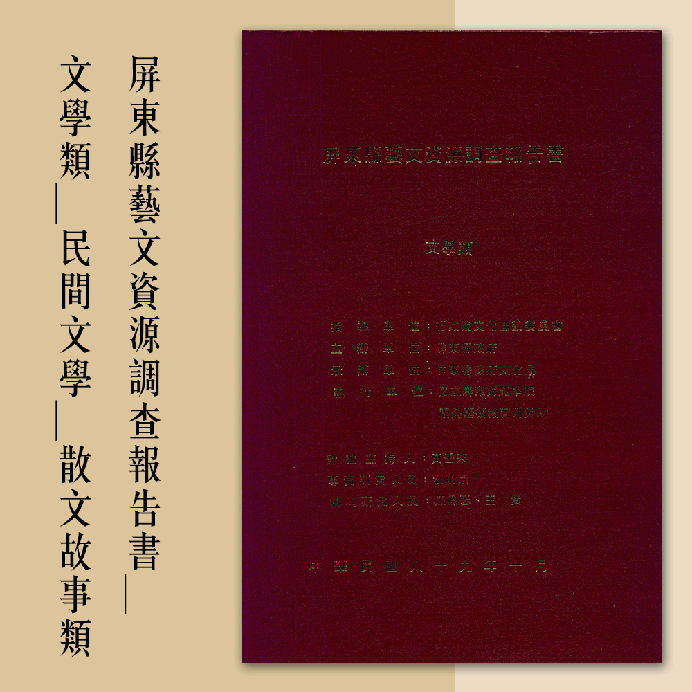本研究是屏東縣立文化中心奉行政院文化建設委員會指示,爲了解臺灣各地區目前所擁有的藝文資源,以充分運用與發揮地方藝文特色,而進行之「屏東縣藝文資源調查」項下的「文學類」子研究計畫。民間文學為流傳在民間,口耳相傳的故事、歌謠、傳說、諺語等等,並不是作家刻意創作的文學作品,世世代代傳承下來,成為文化的一部份,也形成了一個民族的特色。但以往因種種原因,民間文學並不受重視,甚或被鄙視。隨著耆老們的日漸凋零,若不趕快將這些資料蒐集完整,恐怕日後即將亡軼而難再尋找,如此便會永遠失去我們珍貴的文化遺産。故事類已出版成書的著作很多,另外在方志或地方采風錄中保存許多民間故事等等,本文針對散文故事類,包含神話、傳說、民間故事等進行調查作業,收錄了共79則民間故事,多為原住民神話及傳說故事。