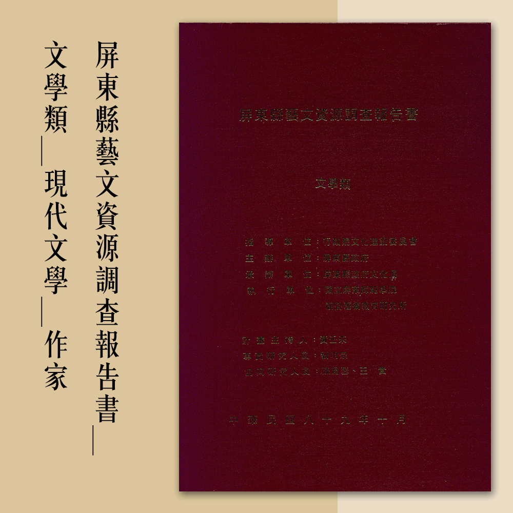 本研究是屏東縣立文化中心奉行政院文化建設委員會指示,爲了解臺灣各地區目前所擁有的藝文資源,以充分運用與發揮地方藝文特色,而進行之「屏東縣藝文資源調查」項下的「文學類」子研究計畫。現代詩、散文、小說等散見於現今可見的出版品,因此原則上不在此研究報告重複收錄,而以收集作家及文學社團資料爲主。作家資料以屏東縣籍或定居屏東縣者爲主要蒐集對象,其資料之取得主要途徑有四:(1)問卷調查法;(2)資料庫或人名錄的文獻蒐集;(3)參考屏東縣立文化中心(現為屏東縣政府文化處)出版的作家作品集;(4)查詢「全國圖書聯合目錄」等線上目錄。本文針對屏東縣現代文學作家進行調查作業,收錄了共89位作家。