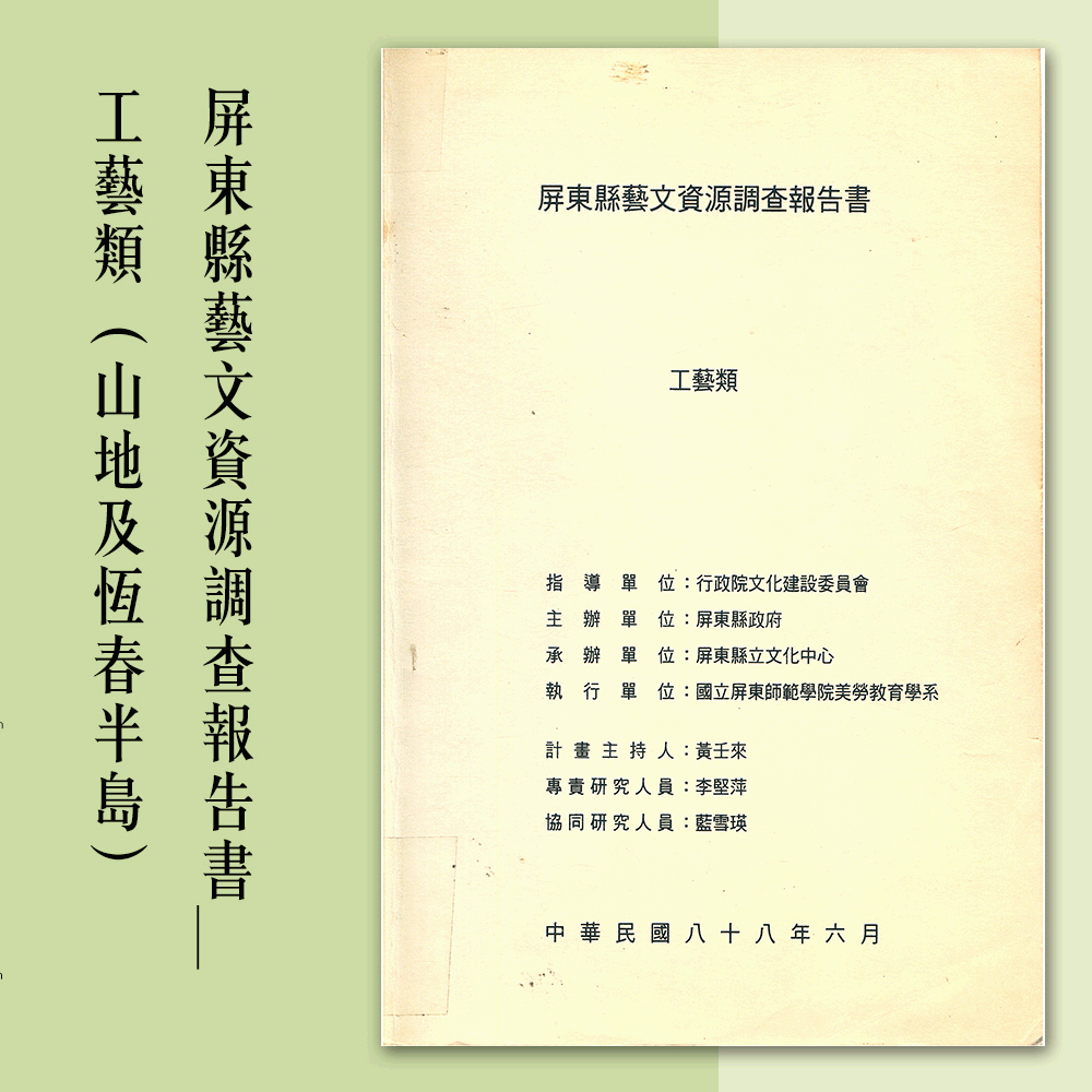 本研究是屏東縣立文化中心奉行政院文化建設委員會指示,爲了解臺灣各地區目前所擁有的藝文資源,以充分運用與發揮地方藝文特色,而進行之「屏東縣藝文資源調查」項下的「工藝類」子研究計畫。工藝是指「精巧的技藝」,通常具有生活實用價值,並含有美觀、實用、經濟與原創性的特質,類別依分類標準不同而有差異。屏東縣具有獨特工藝藝文資源、工藝種類多樣但亦有偏頗現象,且工藝藝文資源並不豐盛、藝文活動也不旺盛、專業人口亦不多量,屏東縣工藝特色呈現資源弱化或消逝。本文針對屏東縣山地區及恆春半島共14件工藝類藝文資源,包含瑪家鄉2件、車城鄉1件、牡丹鄉1件、恆春鎮10件,進行調查作業。