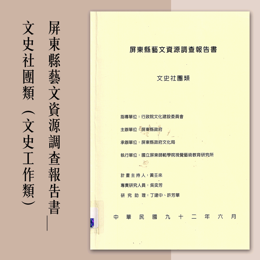 本研究延續88年度屏東縣藝文資源調查第1期研究計畫(共分原住民藝術、美術、工藝、戲劇、傳統建築等5類)與89年度屏東縣藝文資源調查第2期研究計畫(共分文化硬體設施、音樂、文學、人文景觀4類)的後續研究計畫,並依行政院文化建設委員會編印「藝文資源調查作業參考手冊」撰寫。本文主要在探討屏東縣「文史社團」之發展現況,以充分掌握各項文化之完整資料,並據以訂定屏東縣文化發展計畫,建立屏東地方文化之永續發展與自主性。「文史社團」最早萌芽於1990年代期間,多為少數對地方文史工作有興趣者的自發性組織,慢慢地在政府提倡體制化的政策下走向有規章、有組織的民間社團,尤其以1994年文建會主導的文藝季始交由各縣市政府主辦,如此一來地方政府與地區性文史社團等個人團體開始共同協力活動的舉行,並帶動了地方性文史社團蓬勃的發展。本文針對屏東縣文史工作類文史團體進行調查作業,共29個文史工作類文史團體,其中包含「九如之美社區報」、「林仔邊自然文史工作室」、「東港文史協會」、「財團法人椰林文教基金會」、「瓊麻園城鄉文教發展協會」等等。