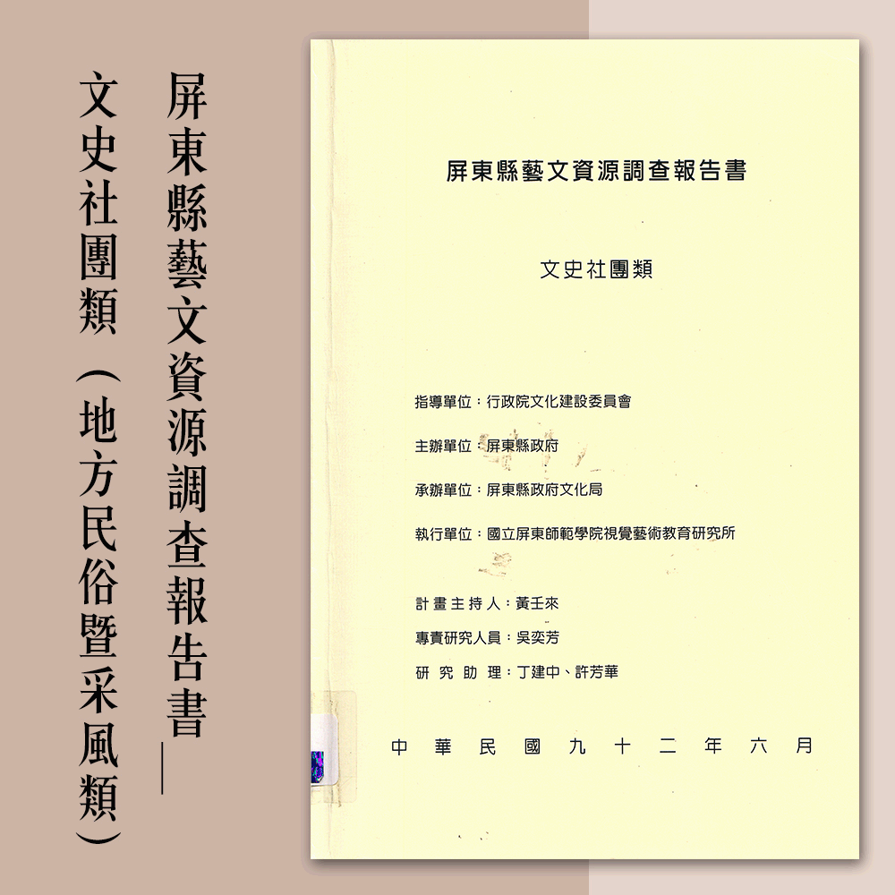 本研究延續88年度屏東縣藝文資源調查第1期研究計畫(共分原住民藝術、美術、工藝、戲劇、傳統建築等5類)與89年度屏東縣藝文資源調查第2期研究計畫(共分文化硬體設施、音樂、文學、人文景觀4類)的後續研究計畫,並依行政院文化建設委員會編印「藝文資源調查作業參考手冊」撰寫。本文主要在探討屏東縣「文史社團」之發展現況,以充分掌握各項文化之完整資料,並據以訂定屏東縣文化發展計畫,建立屏東地方文化之永續發展與自主性。「文史社團」最早萌芽於1990年代期間,多為少數對地方文史工作有興趣者的自發性組織,慢慢地在政府提倡體制化的政策下走向有規章、有組織的民間社團,尤其以1994年文建會主導的文藝季始交由各縣市政府主辦,如此一來地方政府與地區性文史社團等個人團體開始共同協力活動的舉行,並帶動了地方性文史社團蓬勃的發展。本文針對屏東縣地方民俗暨采風類文史團體進行調查作業,共4個文史工作類文史團體,其中包含「民俗技藝推廣協會」、「東隆采風工作室」、「萬丹鄉采風社」、「新園采風社」等等。