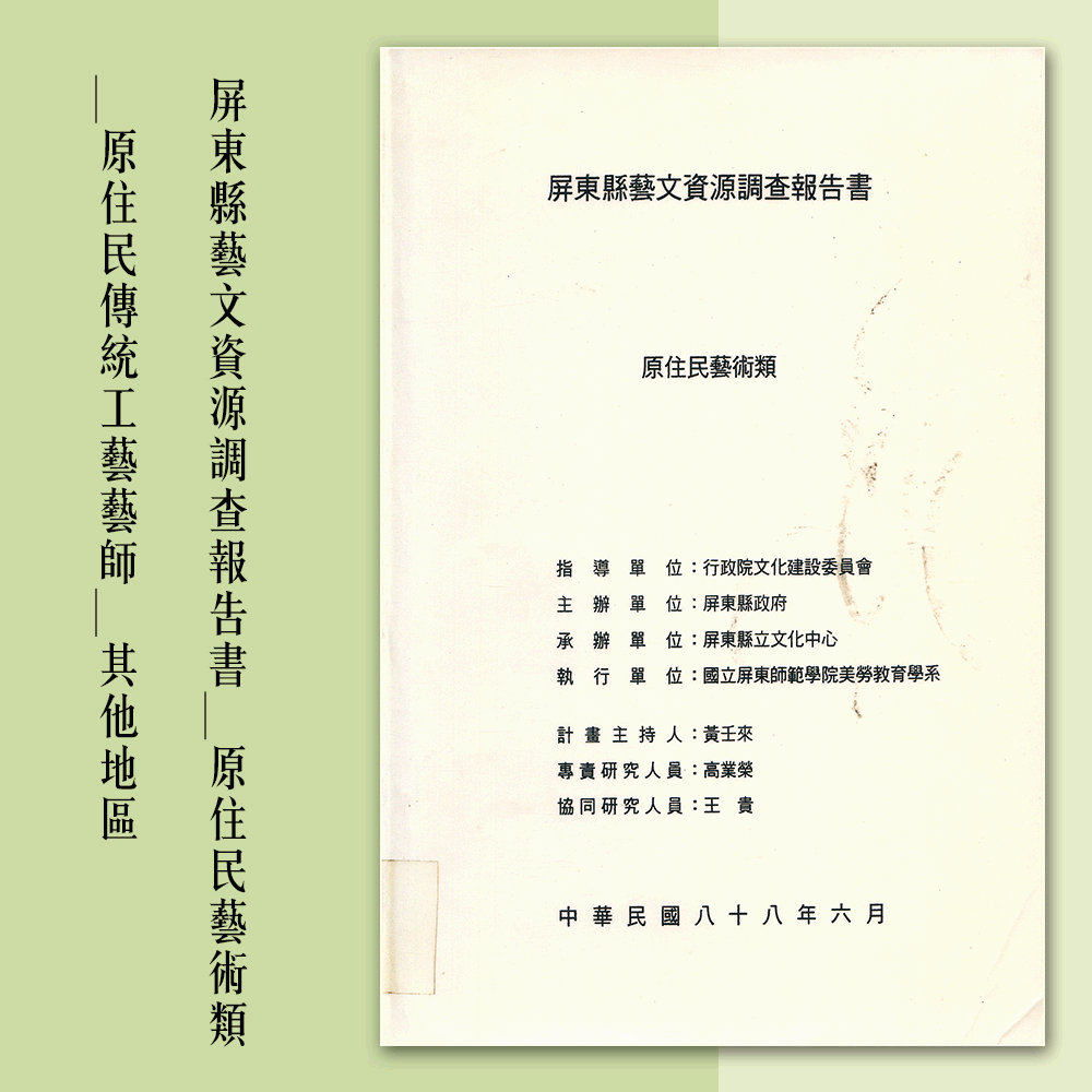 本調查旨在探討屏東縣三地門、霧臺、瑪家、泰武、來義、春日、獅子、牡丹、滿州等地的原住民藝術現況。研究者採取文獻分析、實地訪談、問卷調查等方法,逐一蒐集屏東縣傳統工藝師的個人資料,以及傳統工藝團體的資料,俾建立本縣原住民藝術的人才檔案,作為屏東縣規劃藝文活動及研擬文化發展政策之依據。屏東縣原住民藝術形態,相當豐富而多元,且其藝術人才輩出,堪稱南臺灣之藝術寶庫;近年來,除傳統工藝之傳承表現以外,亦有多種創新表現。隨著臺灣社會急遽變遷,屏東縣原住民藝術仍保有相當的在地色彩,惟對於屏東縣原住民藝術文化的保存、發揚與其經濟發展之互動關係,仍有待積極、長期、縝密的規劃與推動。本研究對於屏東縣、原住民鄉與原住民個人,提出多項建議,以做為原住民藝術永續發展的參考。本文針對屏東縣其他地區傳統工藝藝師進行調查作業,共50人,其中包含春日鄉8人、獅子鄉24人、牡丹鄉5人、滿州鄉1人、高雄縣茂林鄉(現為高雄市茂林區)12人。
