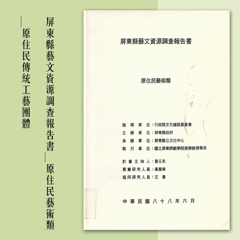 本調查旨在探討屏東縣三地門、霧臺、瑪家、泰武、來義、春日、獅子、牡丹、滿州等地的原住民藝術現況。研究者採取文獻分析、實地訪談、問卷調查等方法,逐一蒐集屏東縣傳統工藝師的個人資料,以及傳統工藝團體的資料,俾建立本縣原住民藝術的人才檔案,作為屏東縣規劃藝文活動及研擬文化發展政策之依據。屏東縣原住民藝術形態,相當豐富而多元,且其藝術人才輩出,堪稱南臺灣之藝術寶庫;近年來,除傳統工藝之傳承表現以外,亦有多種創新表現。隨著臺灣社會急遽變遷,屏東縣原住民藝術仍保有相當的在地色彩,惟對於屏東縣原住民藝術文化的保存、發揚與其經濟發展之互動關係,仍有待積極、長期、縝密的規劃與推動。本研究對於屏東縣、原住民鄉與原住民個人,提出多項建議,以做為原住民藝術永續發展的參考。本文針對屏東縣傳統工藝團體進行調查作業,共51團,其中包含「原鄉服飾文化藝術社」、「雯琪工作坊」、「達瓦蘭部落教室」、「沙滔珠藝工作室」、「俄格手藝工作室」等等。