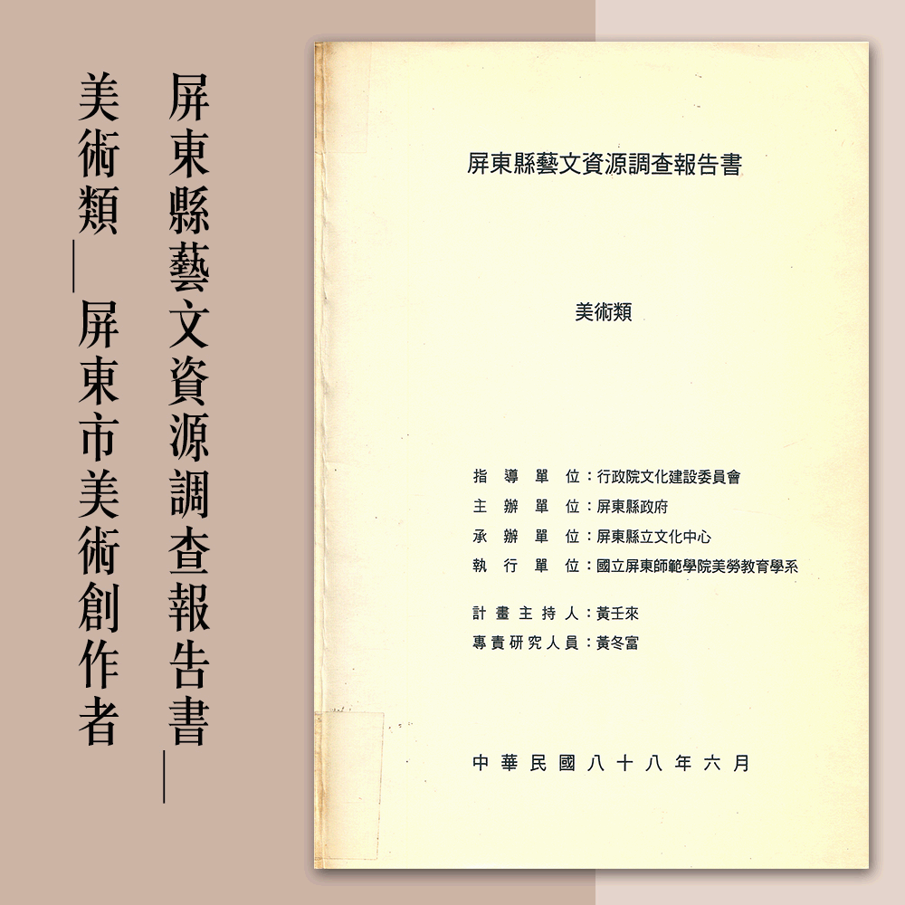 本調查旨在探討屏東縣美術類社團及個別創作者之現況,其範圍包括:設籍屏東縣、旅居屏東縣或曾於屏東縣留存文化者之社團與個人(不含原住民),媒材方面亦涉及西畫、書畫、書法、篆刻、版畫、石雕、木雕、塑造、綜合造形。研究者採取文獻分析與問卷調查法,逐一蒐集屏東縣美術團體及美術創作者的資料與代表作,俾建立屏東縣美術人才檔案,作爲屏東縣規劃藝文活動及研擬文化發展政策之依據。屏東縣美術家創作之藝術形態相當多元與豐富,不論是美術團體或創作者在參與國內、外的藝術活動上,亦甚爲積極,且成績定堪嘉許。隨著臺灣日益國際化、多元化、休閒化、高齡化的社會發展趨向,今後屏東地區的美術發展,有待加強本地文化特色的維護與發揚,以及與其他地區文化的交流,俾促進藝術的共榮與成長。本文就屏東縣屏東市美術創作者進行調查作業,共79人。