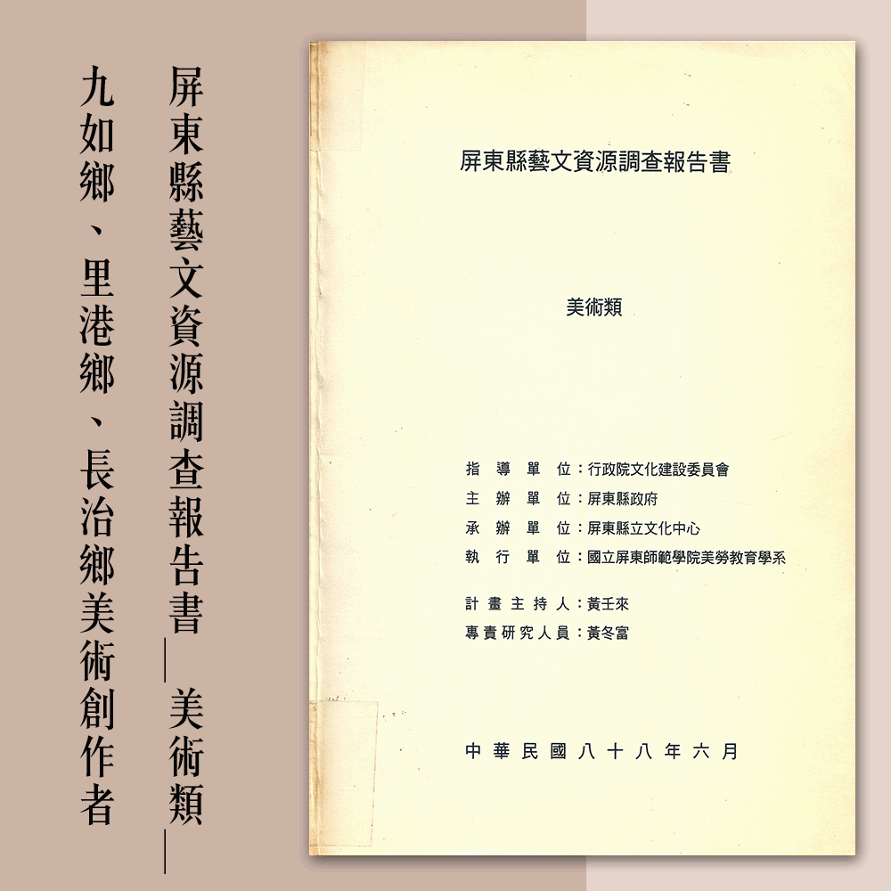本調查旨在探討屏東縣美術類社團及個別創作者之現況,其範圍包括:設籍屏東縣、旅居屏東縣或曾於屏東縣留存文化者之社團與個人(不含原住民),媒材方面亦涉及西畫、書畫、書法、篆刻、版畫、石雕、木雕、塑造、綜合造形。研究者採取文獻分析與問卷調查法,逐一蒐集屏東縣美術團體及美術創作者的資料與代表作,俾建立屏東縣美術人才檔案,作爲屏東縣規劃藝文活動及研擬文化發展政策之依據。屏東縣美術家創作之藝術形態相當多元與豐富,不論是美術團體或創作者在參與國內、外的藝術活動上,亦甚爲積極,且成績定堪嘉許。隨著臺灣日益國際化、多元化、休閒化、高齡化的社會發展趨向,今後屏東地區的美術發展,有待加強本地文化特色的維護與發揚,以及與其他地區文化的交流,俾促進藝術的共榮與成長。本文就屏東縣九如鄉、里港鄉、長治鄉美術創作者進行調查作業,共7人。包含汪子儷、蔡振文、鄭吉村、林克嵩、黃淑蓮、張文光、賴文隆。