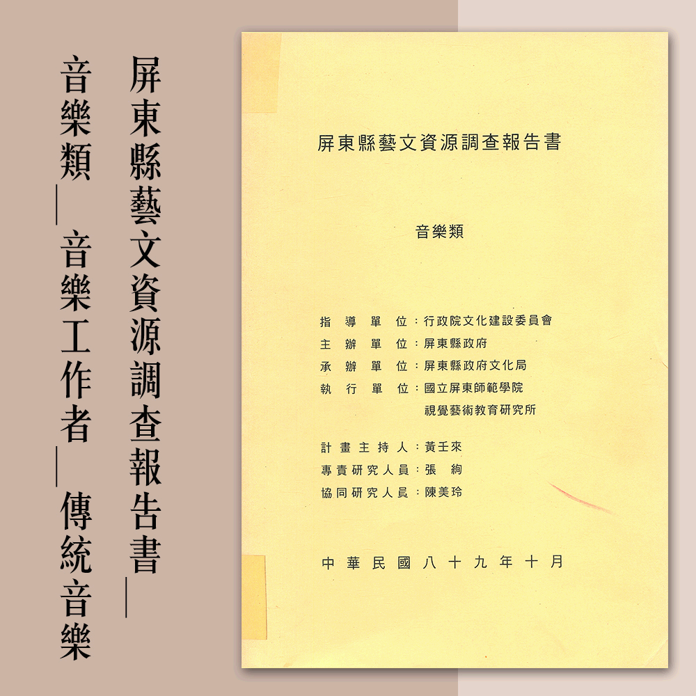 本調查旨在探討屏東縣音樂類社團及音樂工作者之現況,其範圍包括設籍屏東縣、旅居屏東縣或曾於屏東縣留存文化之社團與個人(不含原住民)。研究者主要採取文獻分析與問卷調查法,逐一蒐集屏東縣音樂團體及音樂工作者的資料,俾建立屏東縣人才檔案,作爲屏東縣規劃藝文活動及研擬文化發展政策之依據。屏東縣的音樂風貌相當多元與豐富,隨著臺灣日益國際化、多元化、休閒化的社會發展趨向,今後屏東地區的音樂發展,有待加強本地文化特色的維護與發揚,以及與其他社區文化的交流,俾促進音樂文化的共榮與成長。本文針對屏東縣傳統音樂工作者進行調查作業,共31人。