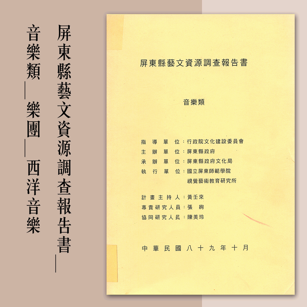 本調查旨在探討屏東縣音樂類社團及音樂工作者之現況,其範圍包括設籍屏東縣、旅居屏東縣或曾於屏東縣留存文化之社團與個人(不含原住民)。研究者主要採取文獻分析與問卷調查法,逐一蒐集屏東縣音樂團體及音樂工作者的資料,俾建立屏東縣人才檔案,作爲屏東縣規劃藝文活動及研擬文化發展政策之依據。屏東縣的音樂風貌相當多元與豐富,隨著臺灣日益國際化、多元化、休閒化的社會發展趨向,今後屏東地區的音樂發展,有待加強本地文化特色的維護與發揚,以及與其他社區文化的交流,俾促進音樂文化的共榮與成長。本文針對屏東縣西洋音樂樂團進行調查作業,共42團。