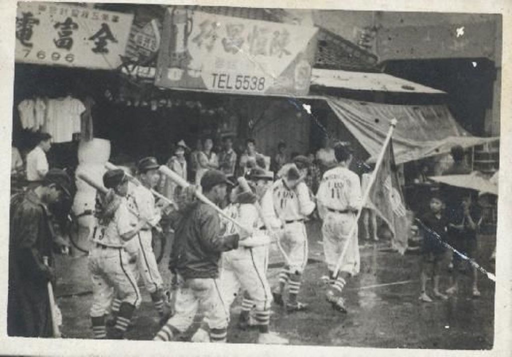 圖為金剛少棒隊經過重新路一段李阿賜店面,金剛少棒隊創辦者陳金朝在企業界鼎鼎大名,和獸醫出身的前三重鎮長是同年代三重名人,研判當時可能少棒隊溽夏去拜訪前鎮長,小朋友們順便吃吃冰棒享受一下吧。