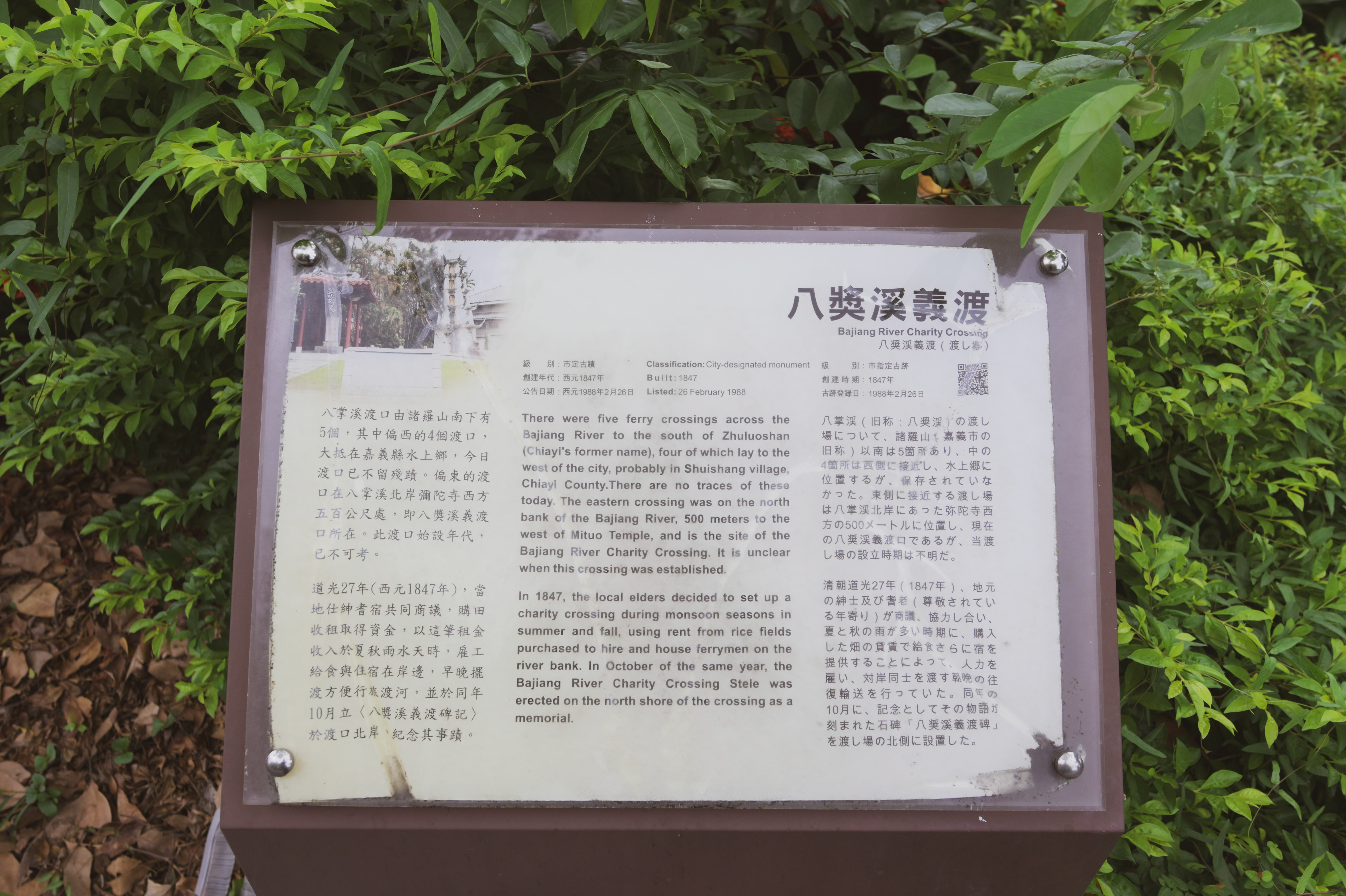 「八獎溪義渡」位於現今嘉義市東區短竹里彌陀路一號,於1847年(清道光27年)8月設置,原址位於八掌溪北岸的彌陀禪寺西方500公尺處。 臺灣地形因南北狹長,中央山脈縱貫其中,地表坡度大,河川大多短而水急。又因降雨時間分配不均,有明顯的枯水期與洪水期之分。夏、秋兩季降雨量多,河川容易暴漲,使得船渡在清領時期成為重要交通工具。八獎溪(今八掌溪)為清領時期嘉義往來中埔的重要水路。根據連橫《臺灣通史》的分類,清領時期臺灣船渡分成「官渡」、「私渡」以及「義渡」三種類型。官渡需繳納渡稅;私渡容易被不肖商人勒索並索取高額費用,甚至有因不遂所求而謀財害命的情況發生。因此,由地方官吏與仕紳倡議並籌措資金設置的義渡,便在此背景下出現 。 相傳1715年(清康熙54年)諸羅知縣周鍾瑄曾在八獎溪設立渡口,以利旅客交通往來,避免私渡任意勒索為害。1847(清道光27年)嘉義當地士紳、耆老共同商議,透過田地收租,將租金收入於夏、秋兩季下雨天時,雇工住宿在岸邊,早晚擺渡以便旅客渡河。並於同年10月立「八獎溪義渡碑」於渡口北岸,作為紀念。「八獎溪義渡」設立後,往來交通更加便捷,促進嘉義地區的經濟發展 。 日治時期,嘉義當地士紳擔心義渡產業遭吞沒,乃推舉郭標及中埔庄長林乾負責「八獎溪義渡」的田產管理。1923年(大正12年)「八獎溪義渡」逐漸被鐵線橋取代。1945年(昭和20年)3月「八獎溪義渡碑」被移置到八掌溪北岸彌陀寺旁的位置,爾後於3月12日立重修碑於義渡碑記基座。「八獎溪義渡碑」旁立有一座義民塔,為1938年(昭和13年)嘉義市寺廟廢合事件時,嘉義市尹將清領時期三次守城戰役中殉難義士靈骨合祀所建造。「八獎溪義渡」碑體於1988年2月26日公告指定為第三級古蹟。2006年6月23日經嘉義市政府公告類別修正為市定古蹟。