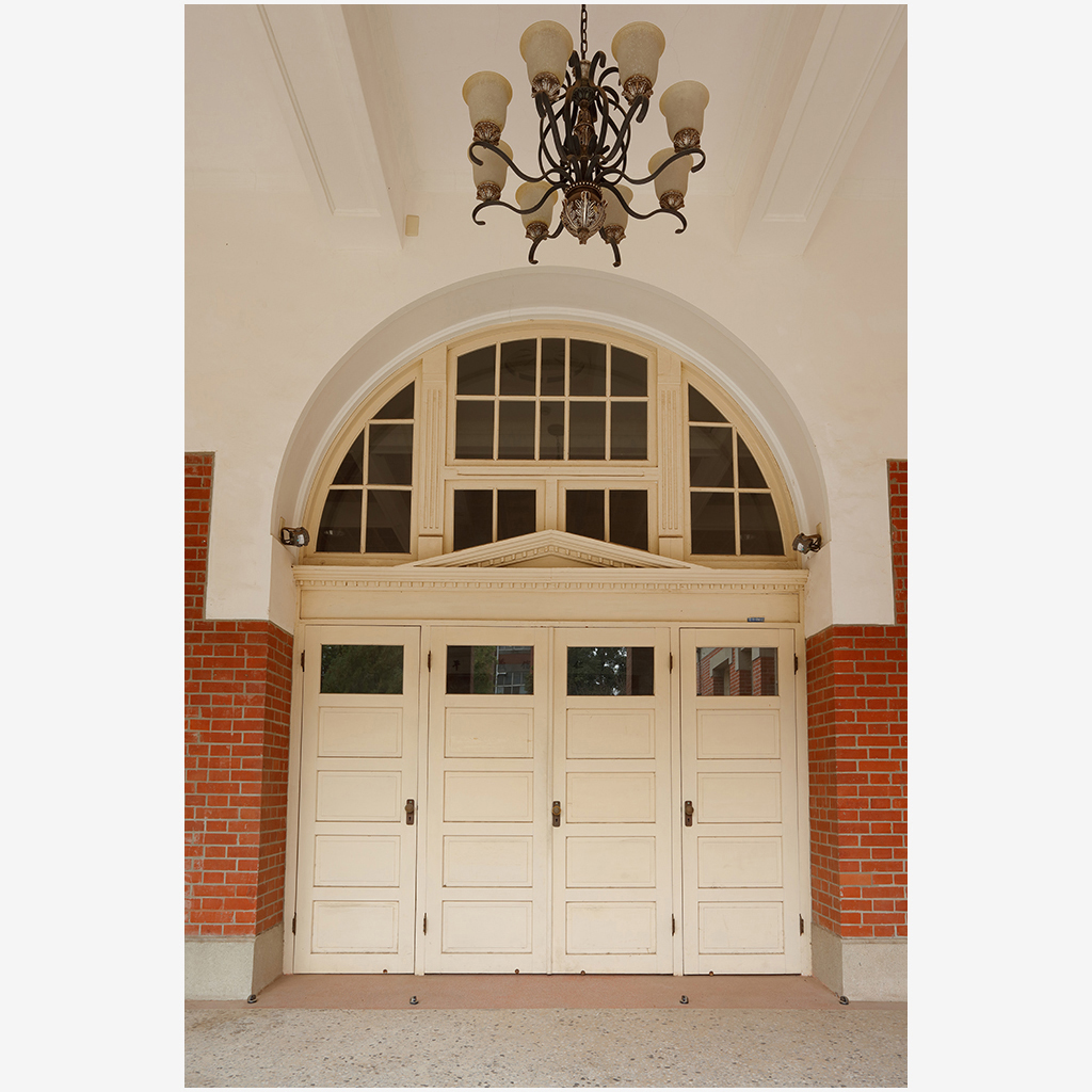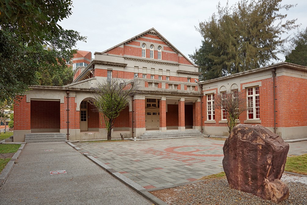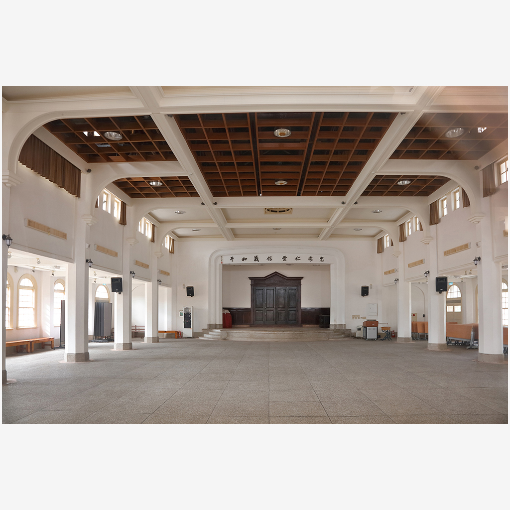 1.一九一五年建,台南州立第一中學內禮堂,為日治時期總督府中學校堂建築之代表。 2.該建物入口設有迴廊、兩側圓拱,中央大空間兩側通廊圓形及半圓型下長型窗,紅磚襯白牆成強烈對比,極具特色。