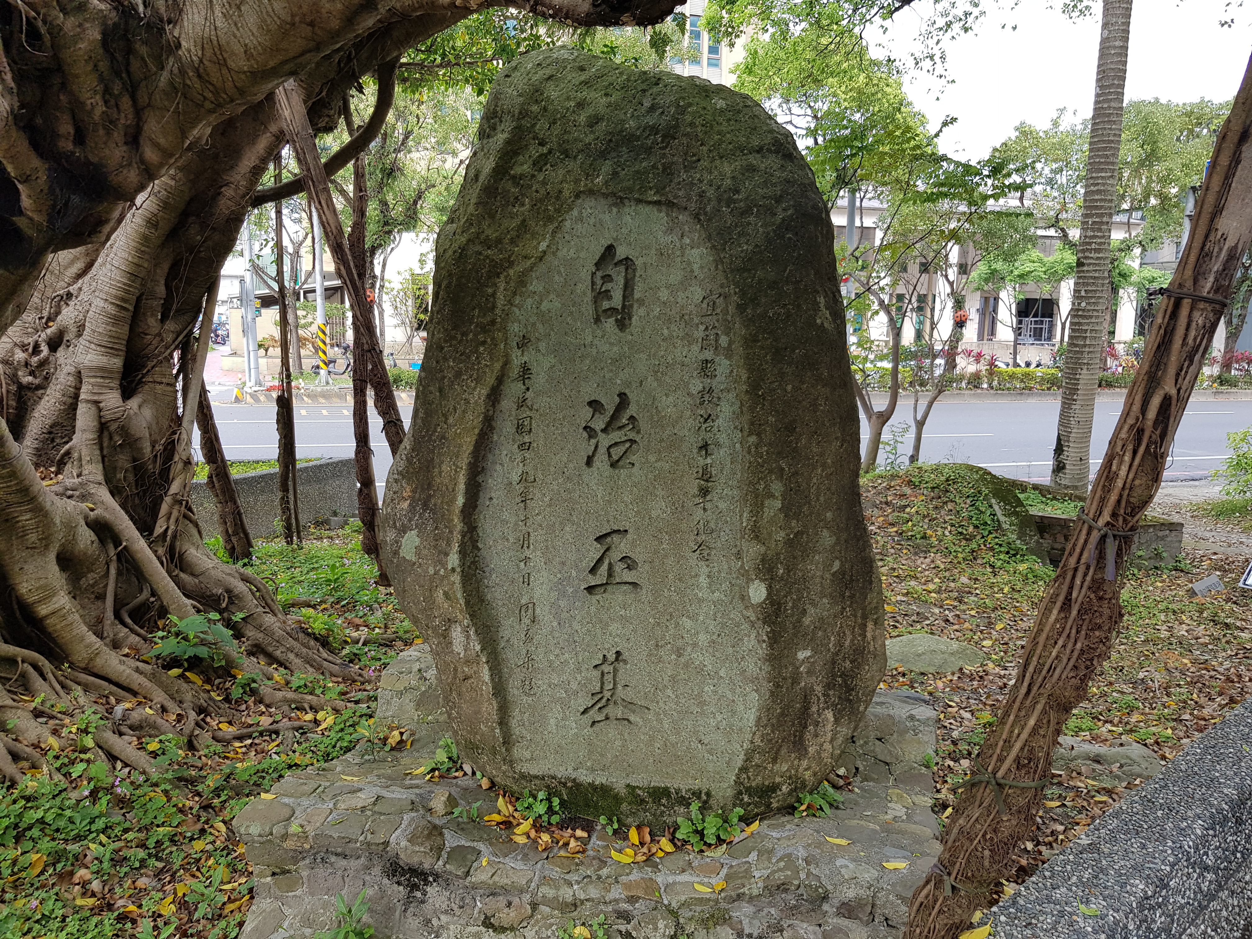 紀念碑為花崗岩雕刻而成,一體兩面,北面為宜蘭設縣紀念碑,並刻有碑文,南面刻有自治丕基。