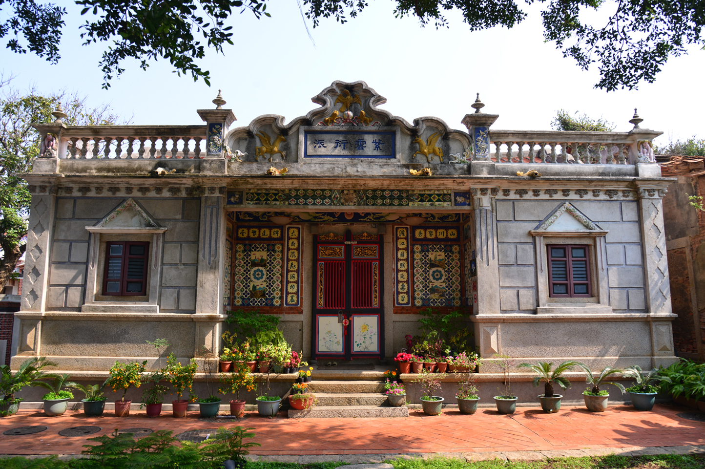 建築格局可分為前後棟,前棟為大九架番仔厝,後棟為一廳兩房,後棟廳現為半開放空間,前後棟間以深井連接。前棟屋頂為傳統雙坡採圓脊型式,屋面為瓦作,立面作榻受、西式山頭、大規壁為圓弧型;後棟主廳屋頂為雙坡圓脊,兩側房之屋頂為磚坪,深井兩側以木樑樓板及磚坪搭接前後棟。 正立面牆面上緣以礪殼灰洗石子作方格裝飾,下緣為石砌,兩側窗楣作三角形,兩股間可見捲草紋樣;側立面面開三扇窗及巷頭門,牆面上緣為磚砌抹灰,下緣為封磉石砌,前兩扇窗楣為弧形、第三窗楣為洋蔥型,窗楣及窗戶間飾有飛鳥泥塑;背立面面開四扇窗,牆面作法同側立面,惟窗楣皆為弧形、窗櫺以磚砌而成,窗楣與窗戶間亦有泥塑裝飾。 前棟立面裝飾華麗,山頭外觀近似三葉型式,中心以藍框及藍字作「紫雲衍派」堂號,堂號上方有飛鷹、雙獅戲球泥塑,左右兩側為飛馬泥塑;四個柱頭外側為天使造型,內側為蓮花主題,上方則分別立有四座寶燈,女兒牆為花瓶欄杆型式。 山頭下方作多層線角及泥塑裝飾,榻受處橫樑以大量彩磁為飾,樣式多元豐富,左右端有兔子造型泥塑,額堵以彩繪裝飾,對看堵、身堵亦使用大量彩磁,聯對也以磁磚方式呈現,外框則可見煙炙磚砌;大規避脊墜以花束與雙獅泥塑裝飾。