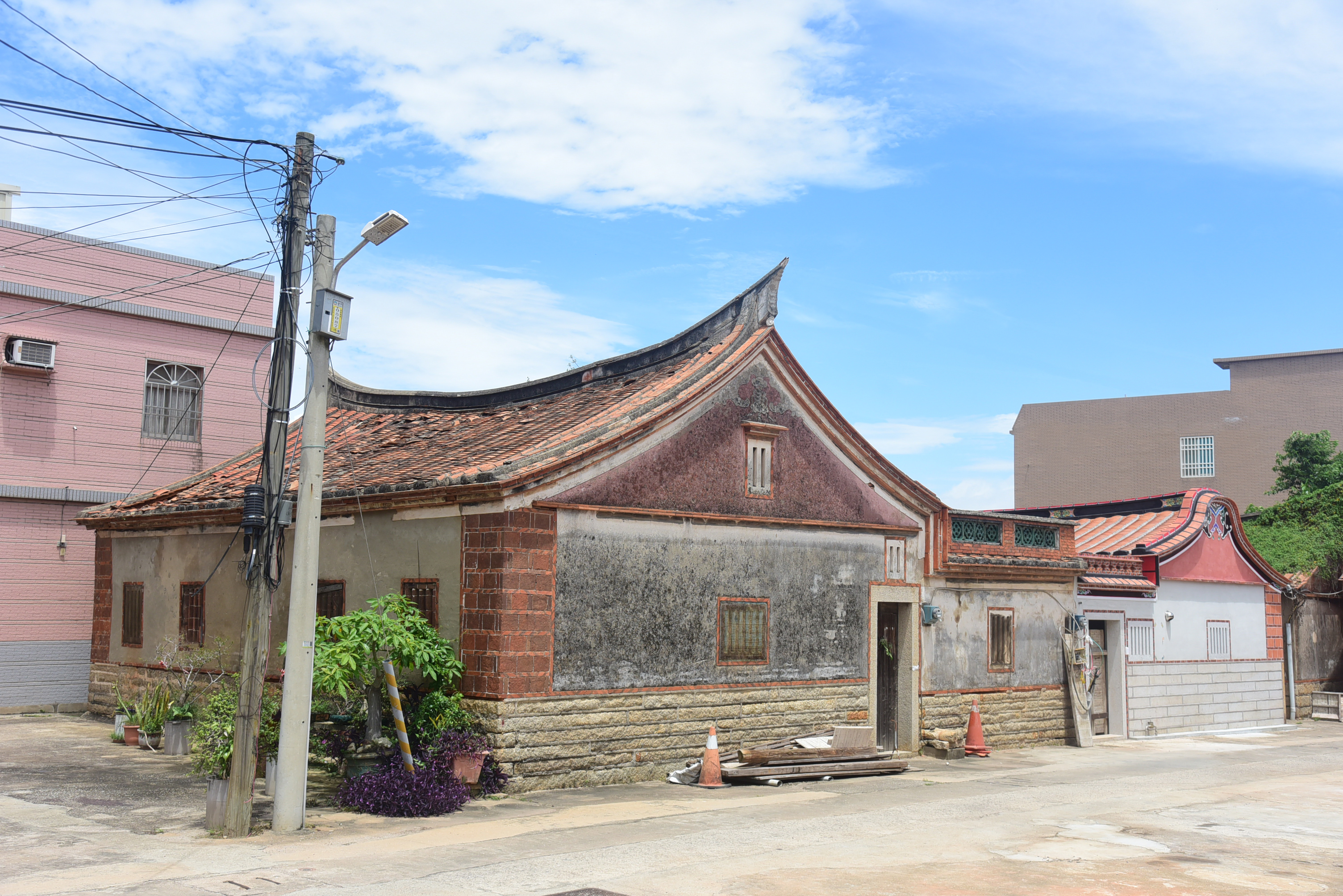 建築為一落二攑頭,屋頂為傳統閩南式雙坡採翹脊型式。正立面圓脊山牆磚砌抹灰,左右攑頭上方有煙炙磚砌女兒牆;外牆下堵為花崗石砌築,上堵磚砌後表層抹灰,牆頂以尺磚收邊,轉角則為傳統斗砌磚柱。 建築本體前有一倒座,正立面牆體與攑頭相接,深井內則興建圍牆區隔地界範圍,形成一共同壁。
