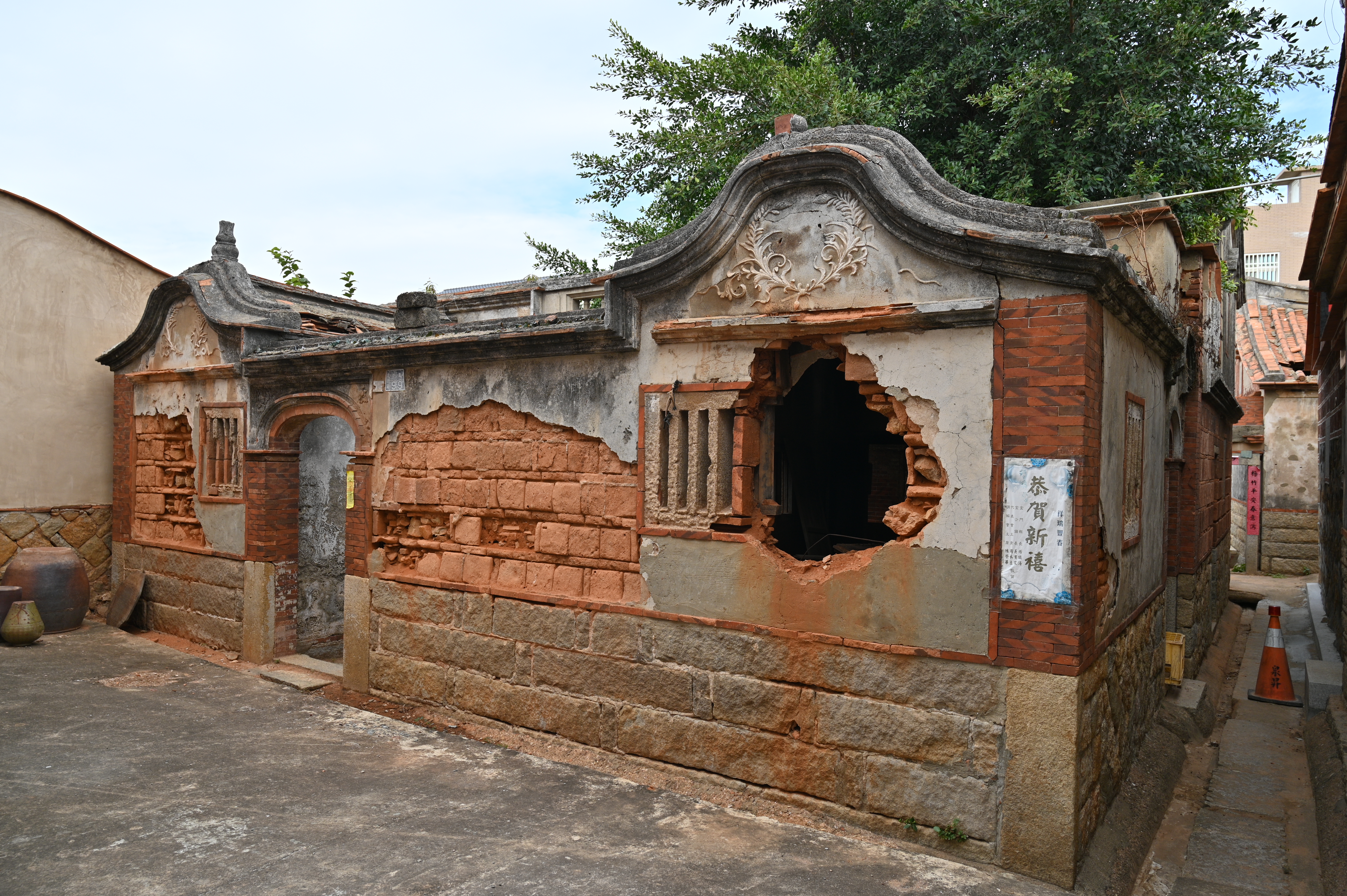 建築整體損壞嚴重,左攑頭立面牆面嚴重破損、臨近巷頭之牆面大型植株攀附;正立面外牆灰壁剝落、磚體外露、風化;因正身屋頂破損致全區木構造長期滲水受潮,多處腐朽坍塌,磚牆亦因灰壁剝落致風化嚴重。