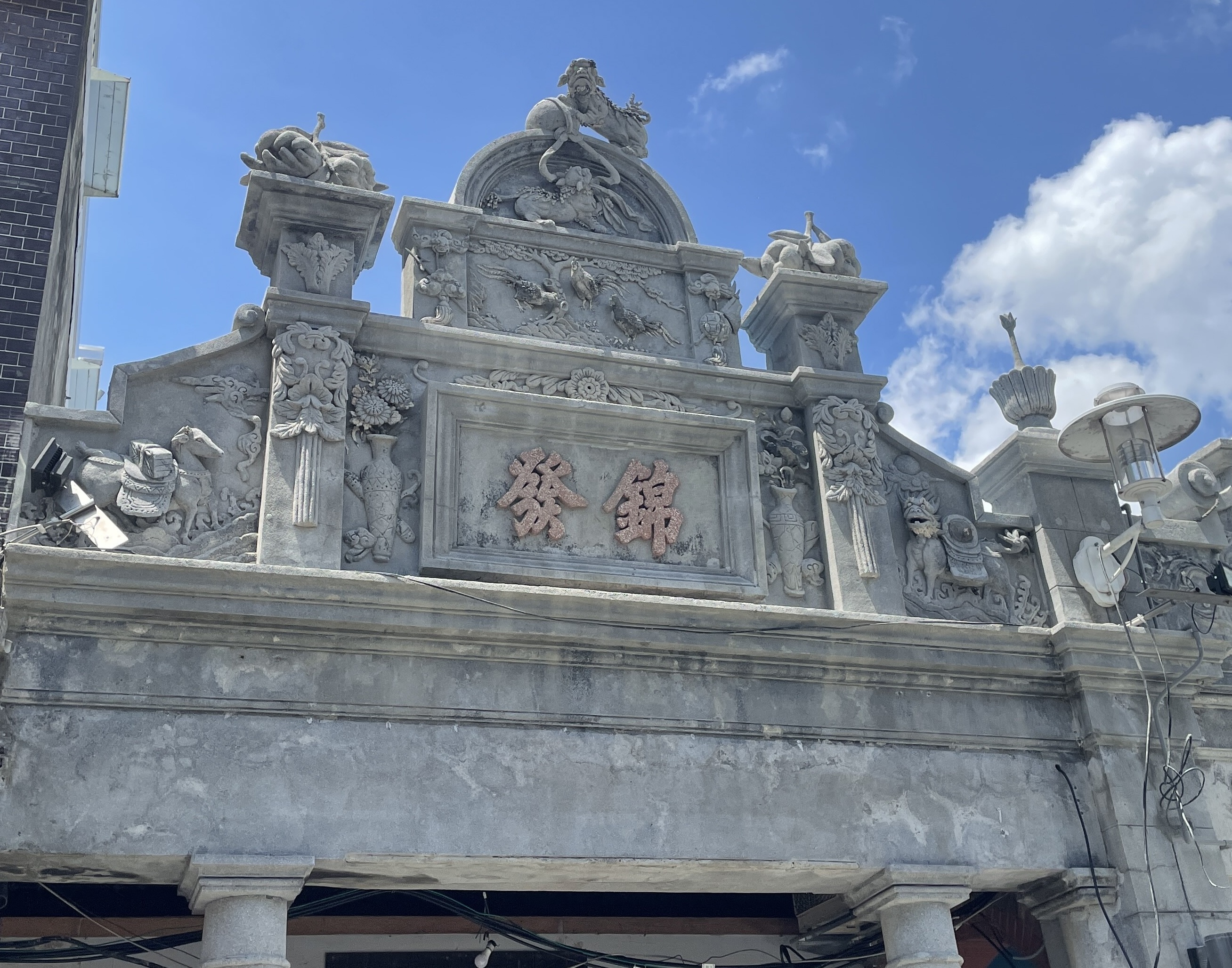 牌樓圓弧形山牆兩側短柱有蝙蝠口銜銅錢的雕飾,引申為「福在眼前」;騎樓間柱為圓柱,底接方形柱珠,上有仿多立克式柱頭,柱身與牌樓面皆以洗石子為飾。